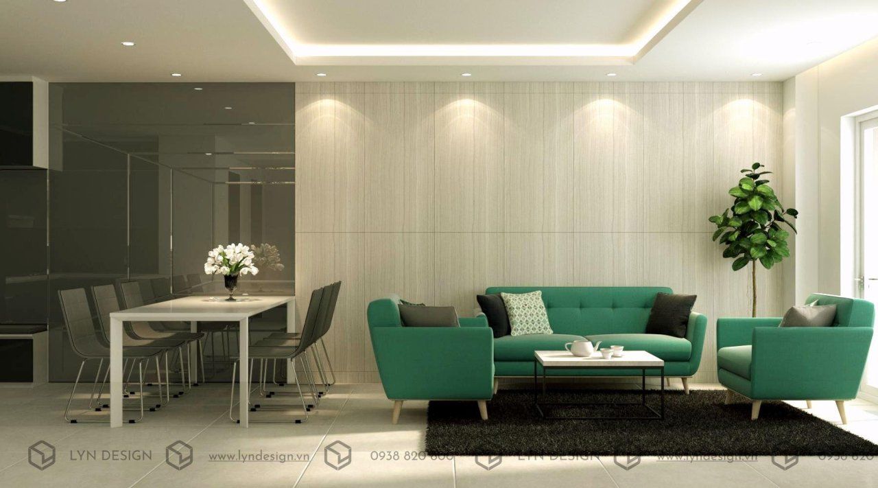 Cũng với tông màu chủ đạo trắng xám với mặt đá đen tại bàn ăn tạo cảm giác không gian rộng. Điểm nhấn là bộ ghế sofa màu xanh ngọc nổi bật không gian phòng khách. Vách tường sử dụng đá lớn tạo cảm giác liền khối và có hình thác nước sinh động tạo cảm giác hài hòa cho căn phòng.
