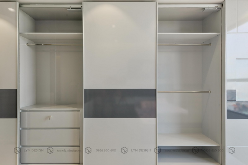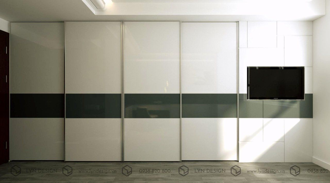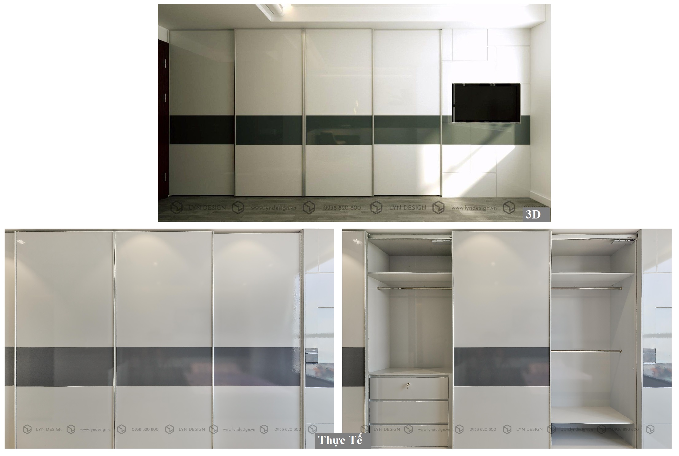 Tủ quần áo được thiết kế với 4 cánh tủ lùa vừa tiết kiệm không gian phần cửa đi vào khi mở tủ, không gian để quần áo rộng rải, thoải mái nhưng không làm mất nhiều không gian chung của căn phòng. Tivi được thiết kế trong kệ âm tường tạo sự đặc biệt cho căn phòng.