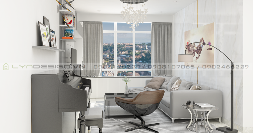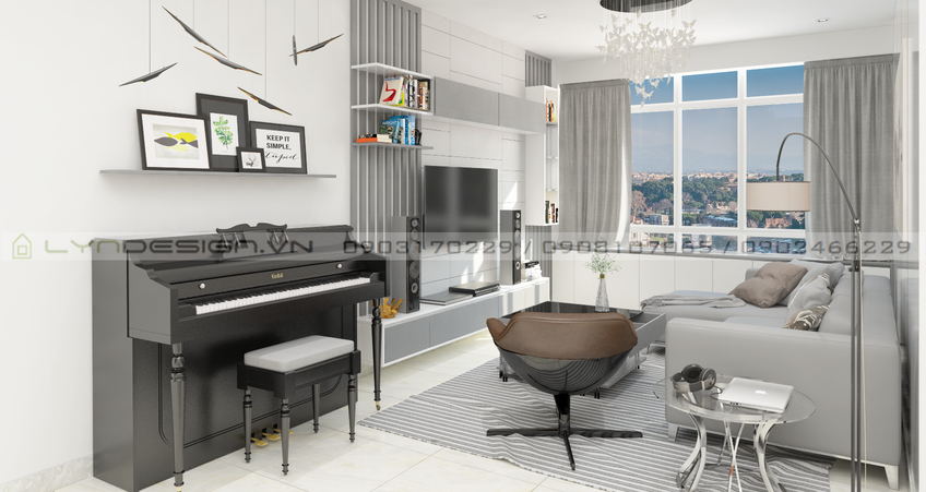 Việc sử dụng quá nhiều đồ đạc trong phòng khách luôn là điểm yếu biến căn hộ trở nên bừa bộn và rối mắt. Chính vì vậy mà với thiết kế này, LYN DESIGN đã khéo léo hạn chế đồ đạc, đường nét đơn giản, tone màu sử dụng chủ yếu là trắng và ghi xám kết hợp cùng màu nâu của đồ gỗ góp phần nhấn mạnh nhiều hơn đến tính công năng của căn phòng.