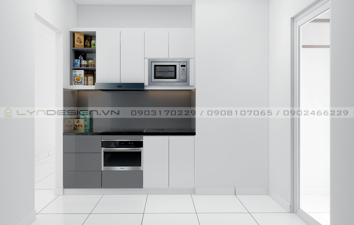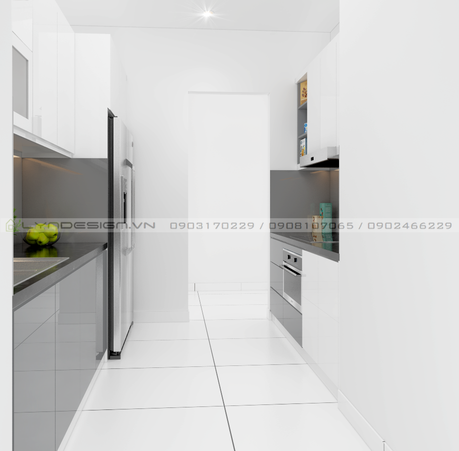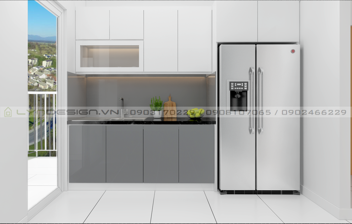 Không gian bếp mở với tone màu trắng sáng tinh tế được thiết kế nhỏ gọn phù hợp với không gian và dụng ý của gia chủ.