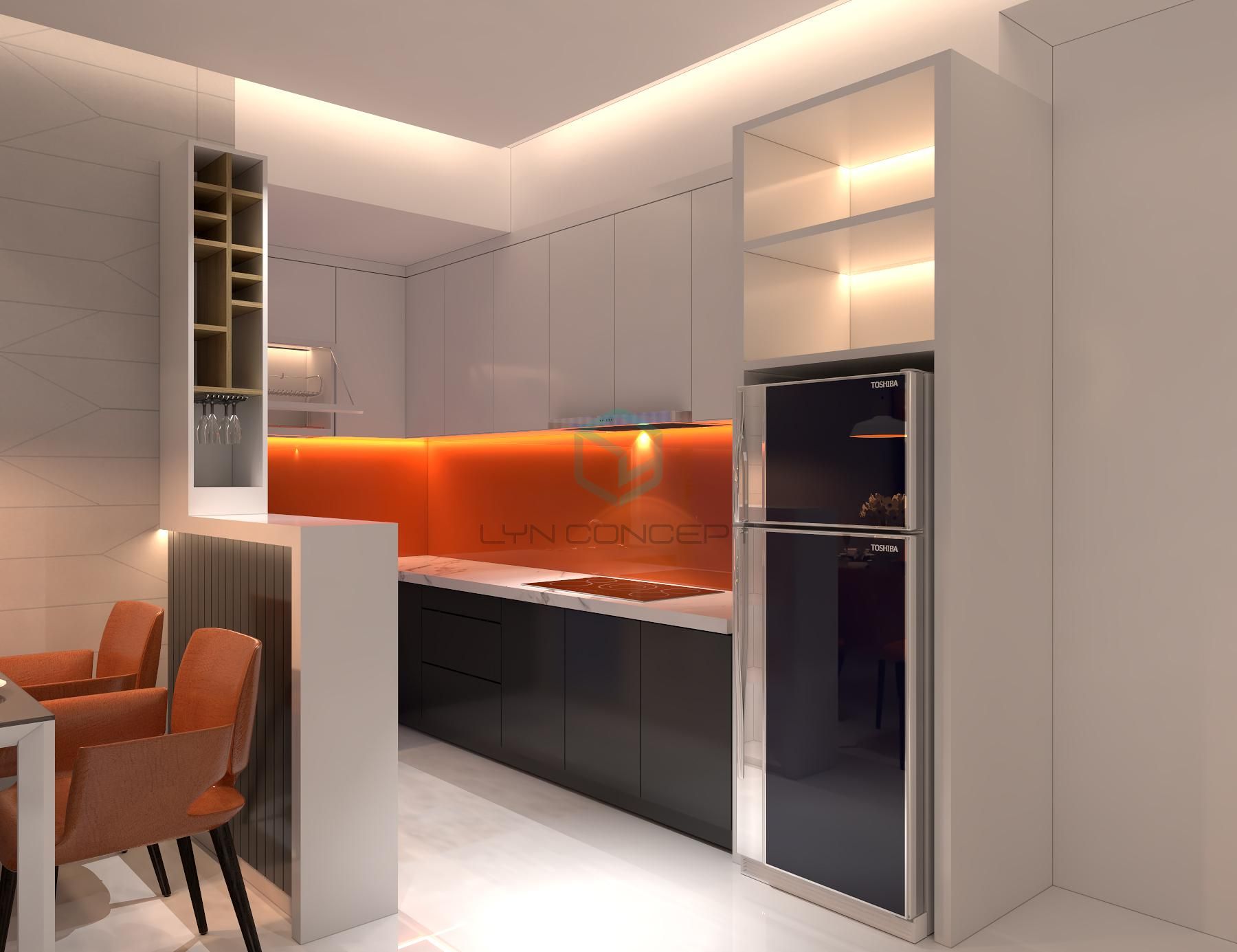 Bên trái phối cảnh là không gian bếp, quầy bar nhỏ và bàn ăn cùng gam màu trắng sang trọng, hiện đại...