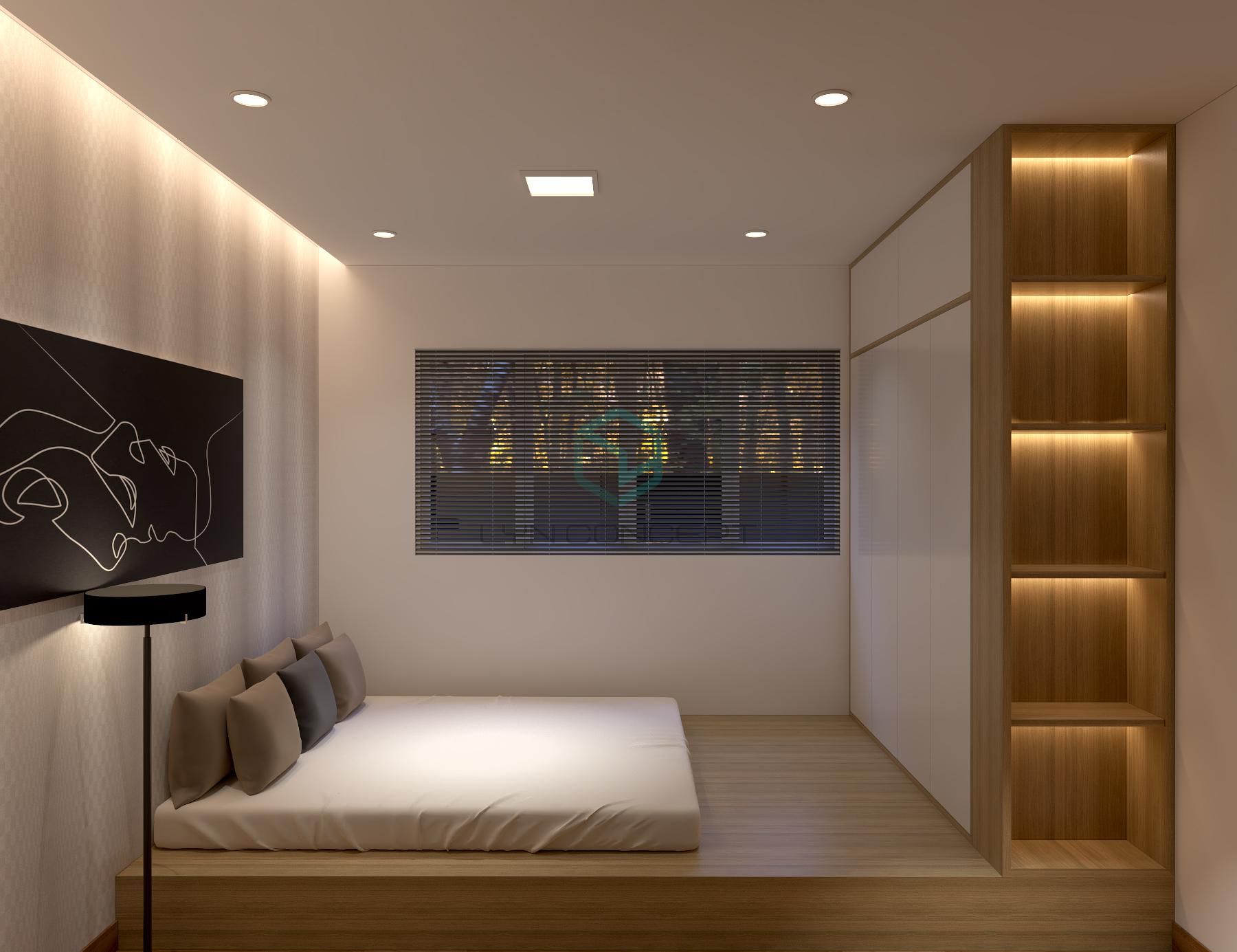 Căn phòng được thiết kế đơn giản với tone màu trầm ấm, không gian vừa đủ, không quá rộng vì dễ mang đến cảm giác trống trải. Gỗ là vật liệu không thể thiếu trong không gian với bục giường và tủ áo bằng gỗ. Sử dụng giấy dán tường cho mảng tường đầu giường.