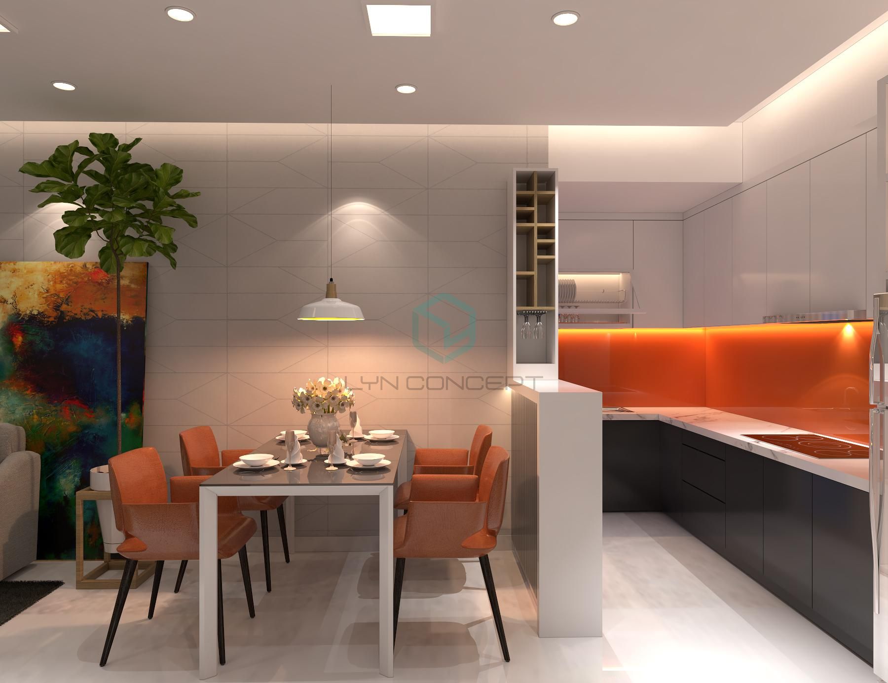 Từ yêu cầu thiết kế nội thất của gia chủ và phương án riêng của nhà thiết kế, LYN Design đã mang đến cho gia đình anh mẫu thiết kế có phong cách hiện đại, thu hút từ một số đồ trang trí. Gam màu chính được sử dụng là trắng-nâu gỗ cùng điểm nhấn là các chi tiết màu cam trẻ trung, đẹp mắt...