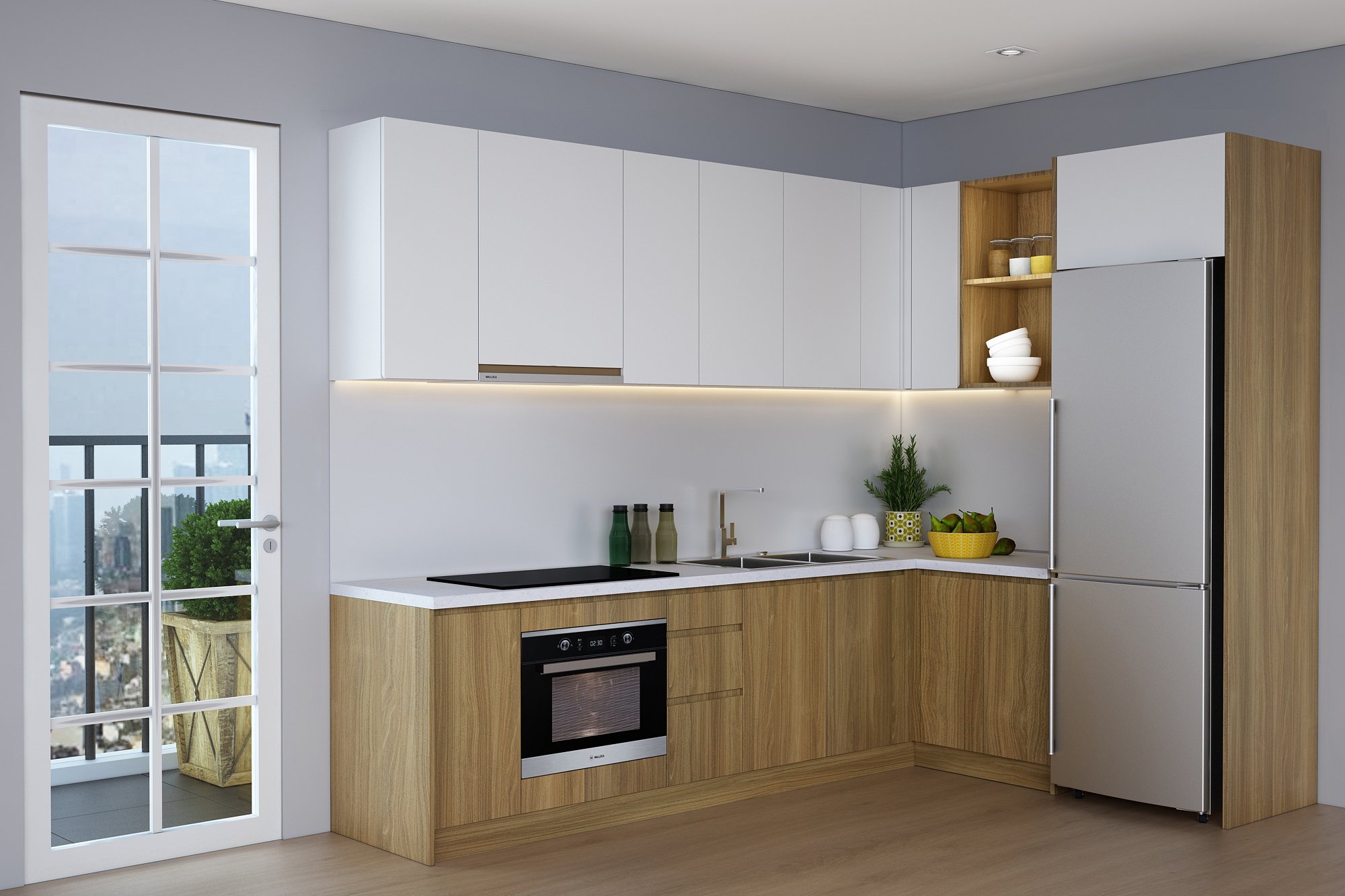 - Giá để dao thớt, kệ gia vị, khay úp chén, giá để xoong nồi, tủ đồ khô chưa bao gồm