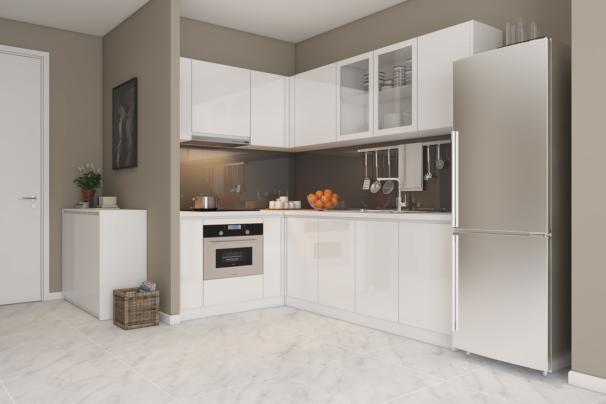 - Giá để dao thớt, kệ gia vị, khay úp chén, giá để xoong nồi, tủ đồ khô chưa bao gồm