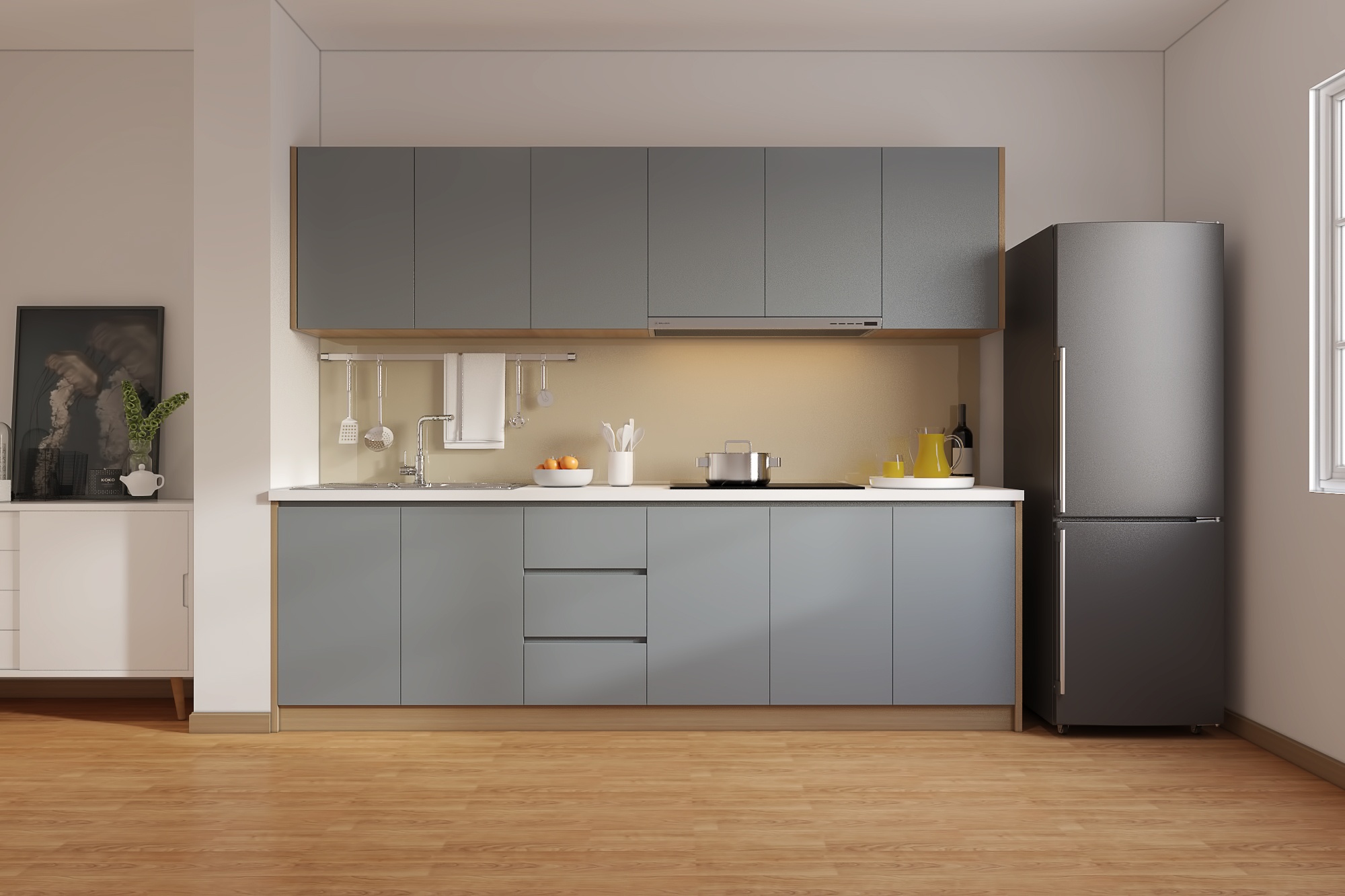 + Phụ kiện miễn phí đi kèm tủ bếp: bản lề giảm chấn, ray bi trượt 3 tầng, tay nắm, pít tông hơi…
