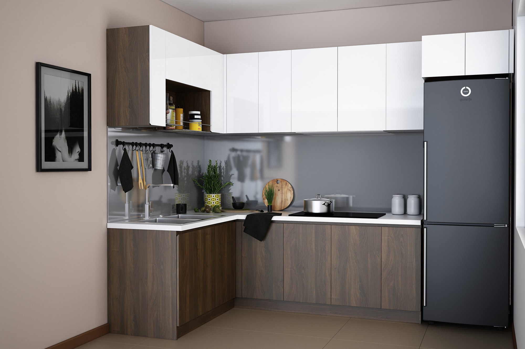 - Kích thước tủ bếp: tùy theo kích thước phòng bếp