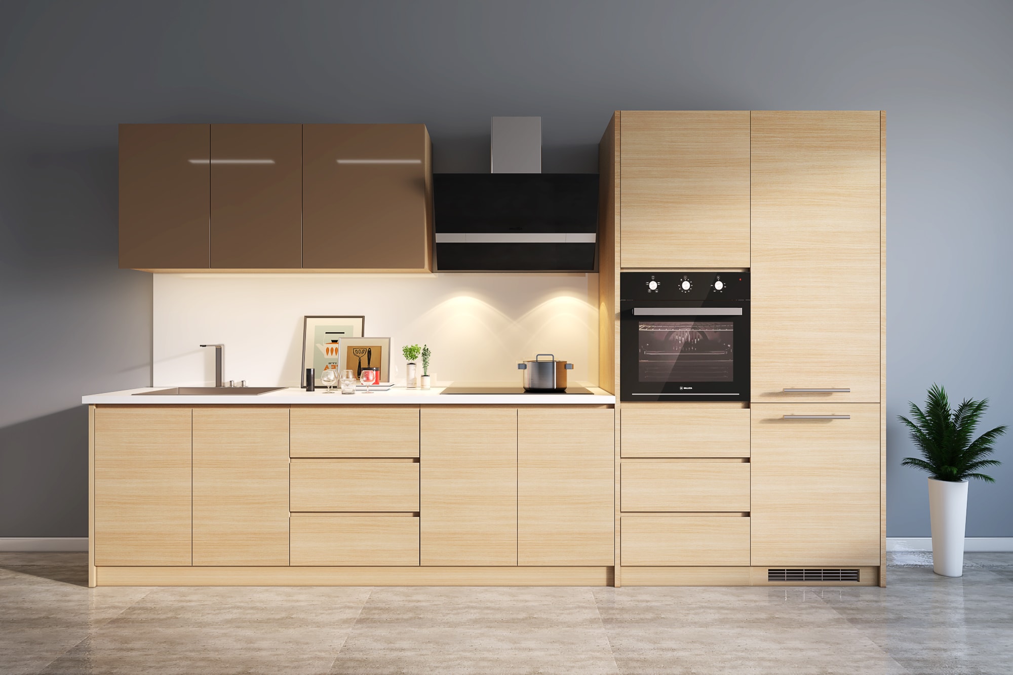 - Kích thước tủ bếp: tùy theo kích thước phòng bếp