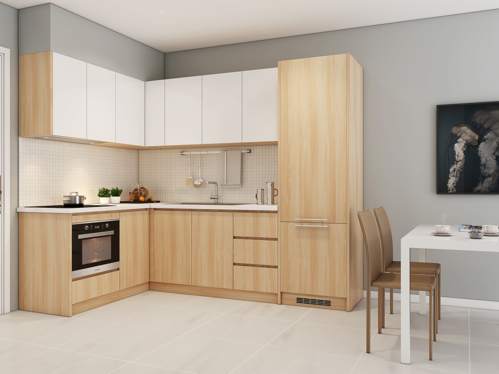 - Kích thước tủ bếp: tùy theo kích thước phòng bếp