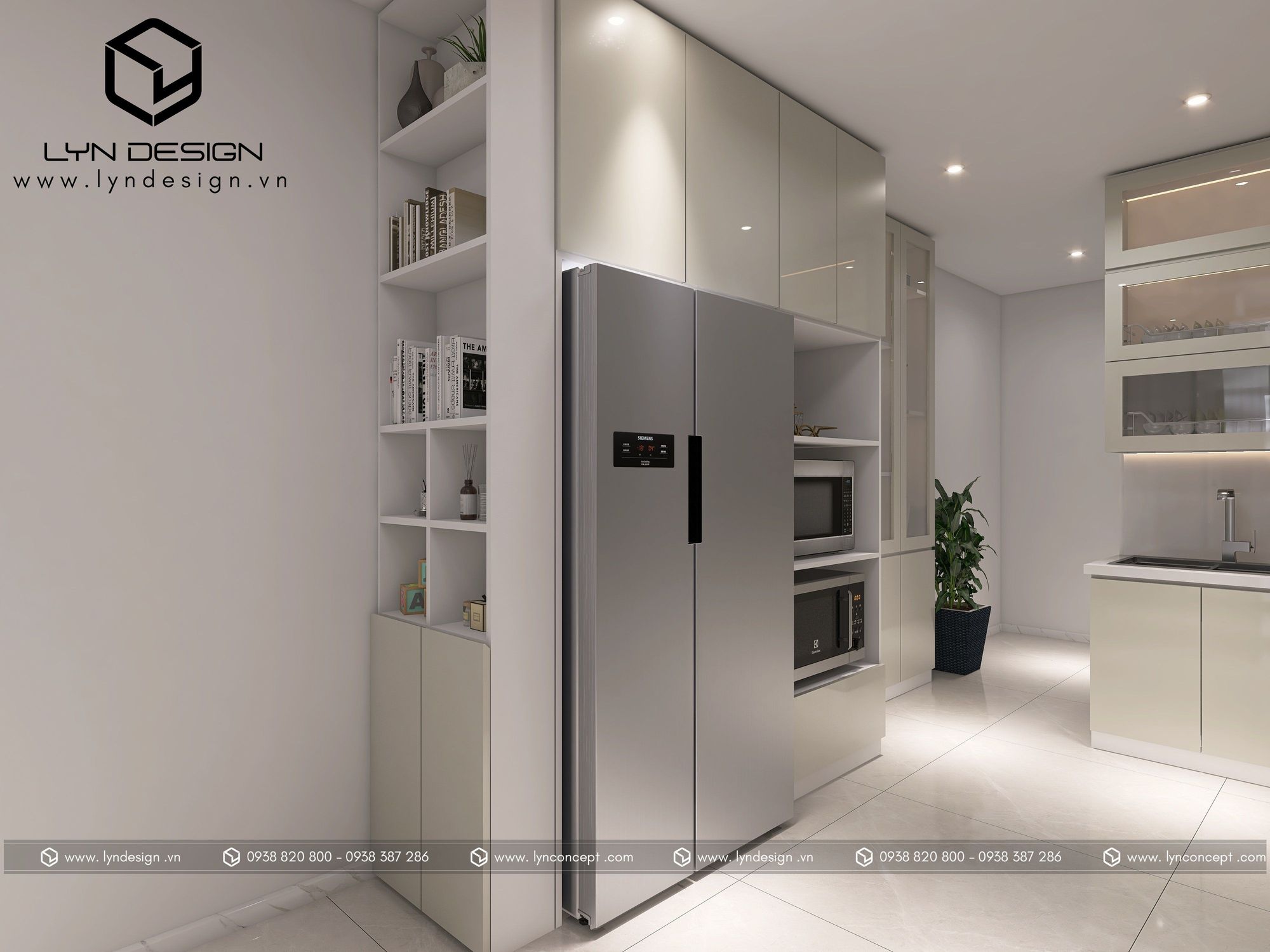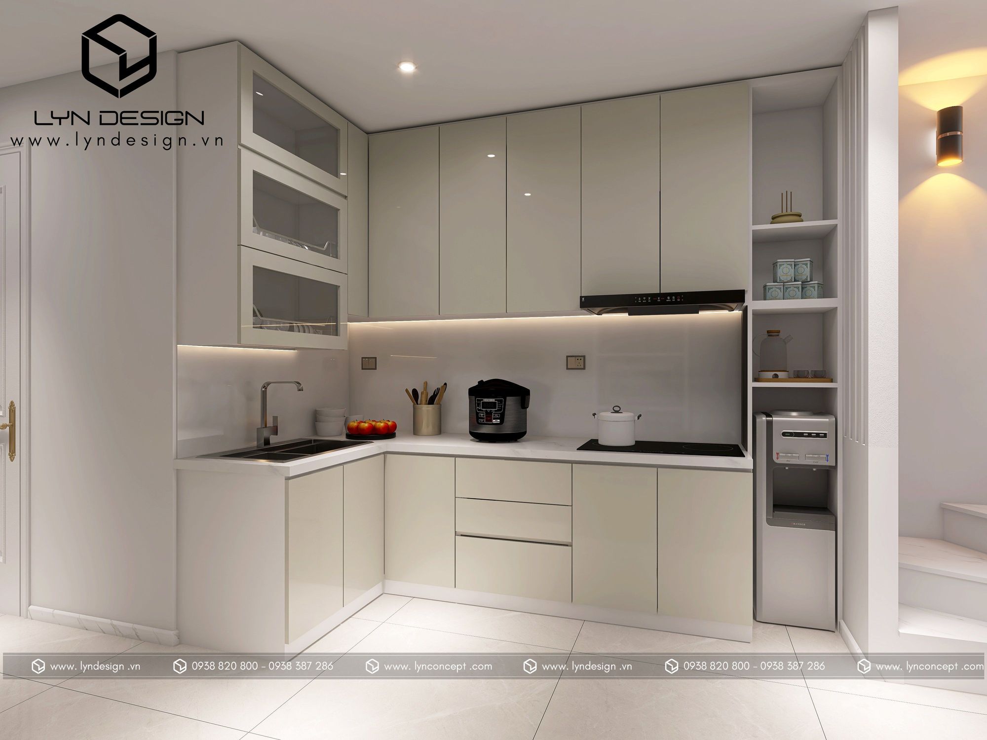 Nằm trong không gian mở với phòng khách, bếp có diện tích khá rộng rãi, không khí thoáng mát, sạch sẽ. Nếu nhìn thẳng vào sẽ thấy bếp có thiết kế khá đơn giản và sạch sẽ, nhưng khi sử dụng lại thấy mọi đồ dùng nội thất đều rất thông minh, tiện nghi và hiện đại vô cùng. Tủ bếp được chia nhiều ngăn giúp người nội trợ dễ dàng sắp xếp đồ gia dụng và tiết kiệm được thời gian, sức lực trong khi nấu ăn.