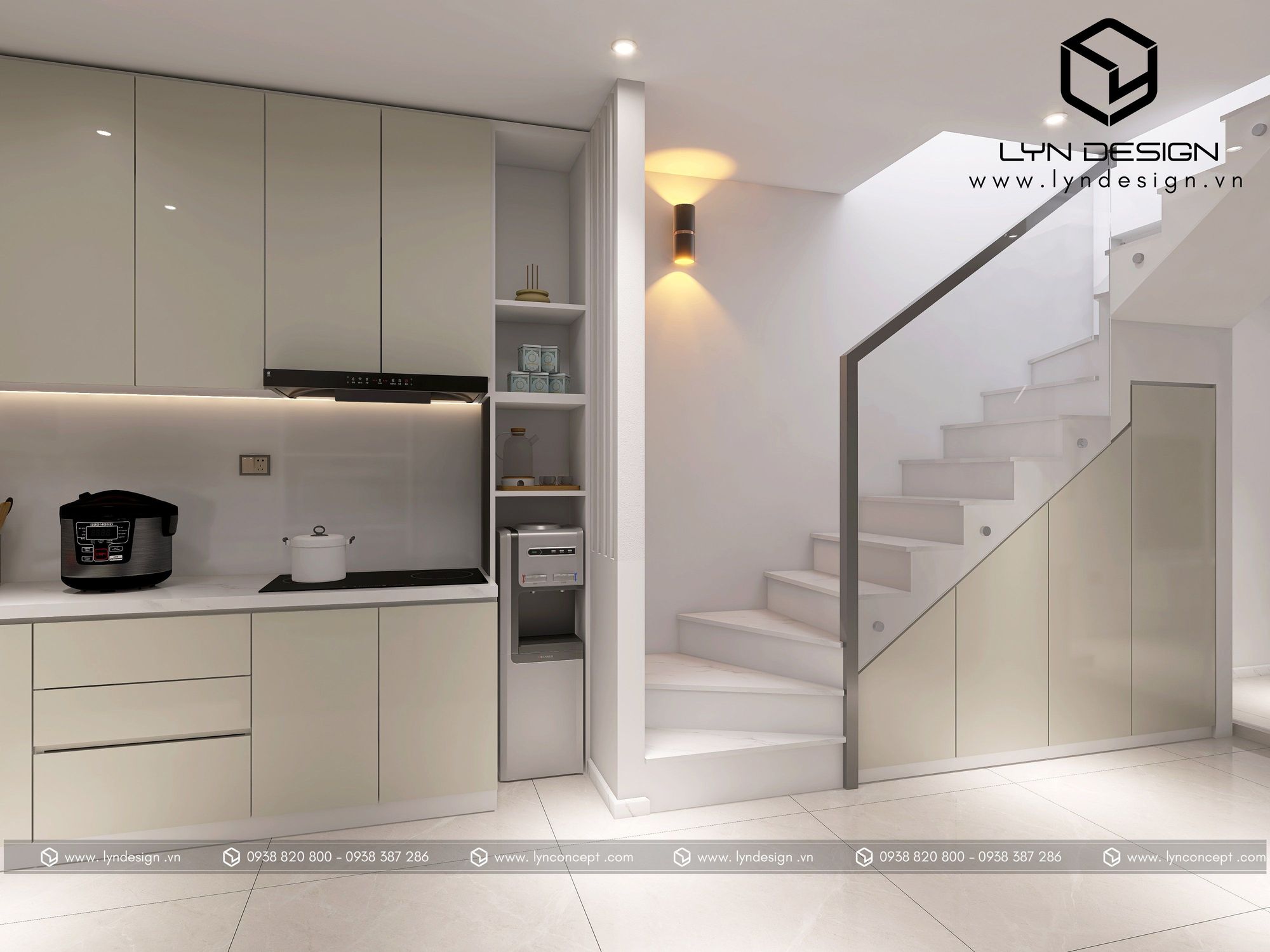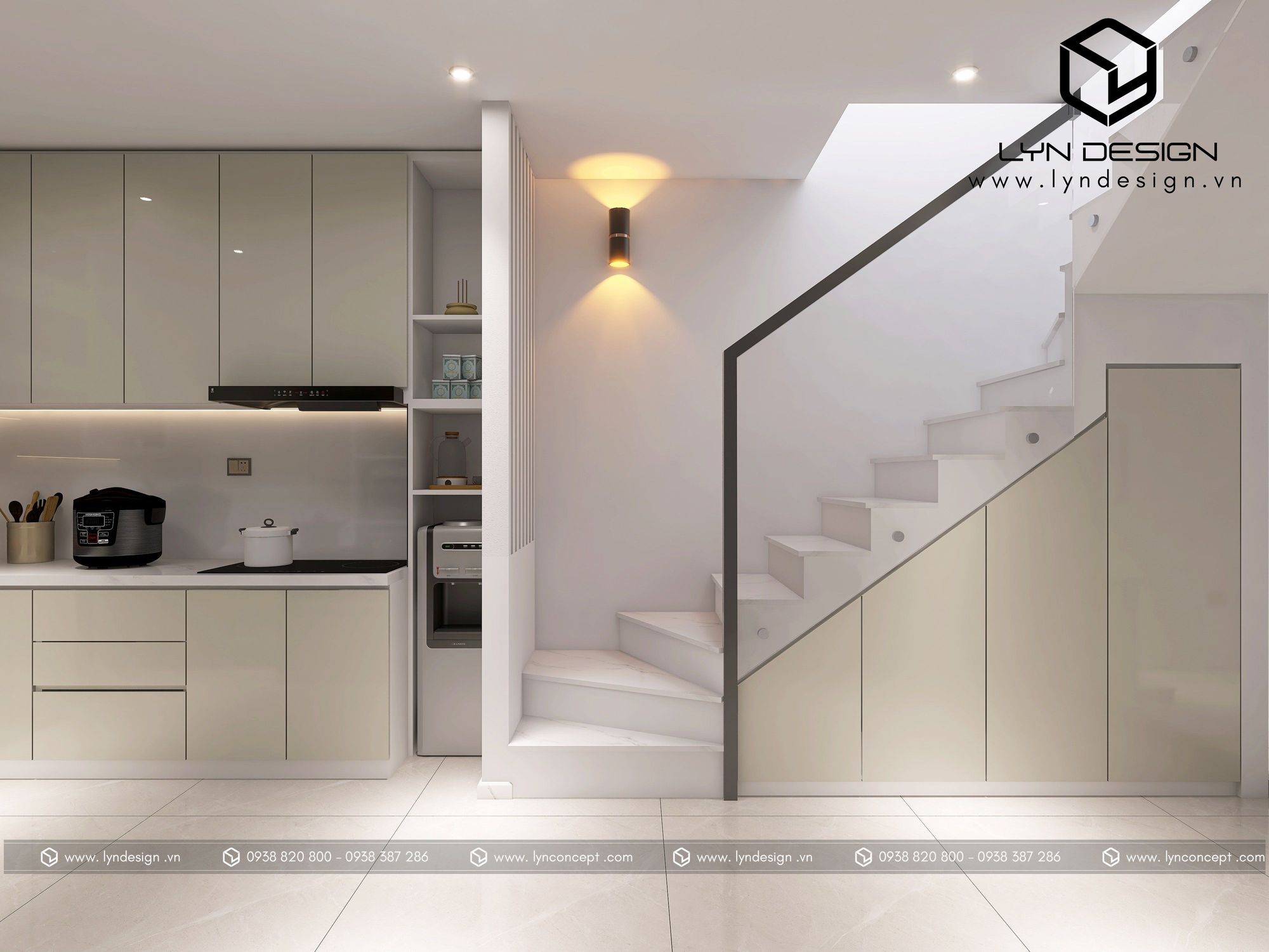 Bên dưới cầu thang được thiết kế tinh tế bằng cách tạo thành những tủ âm tường bắt mắt vô cùng nổi bật. Vừa là điểm nhấn vừa giúp gia chủ có thêm những không gian để lưu trữ đố đạc gọn gàng thuận tiện nhất có thể.
