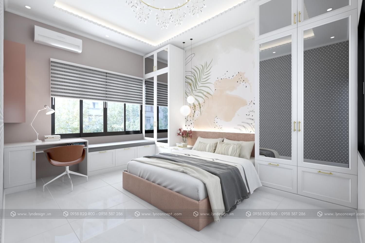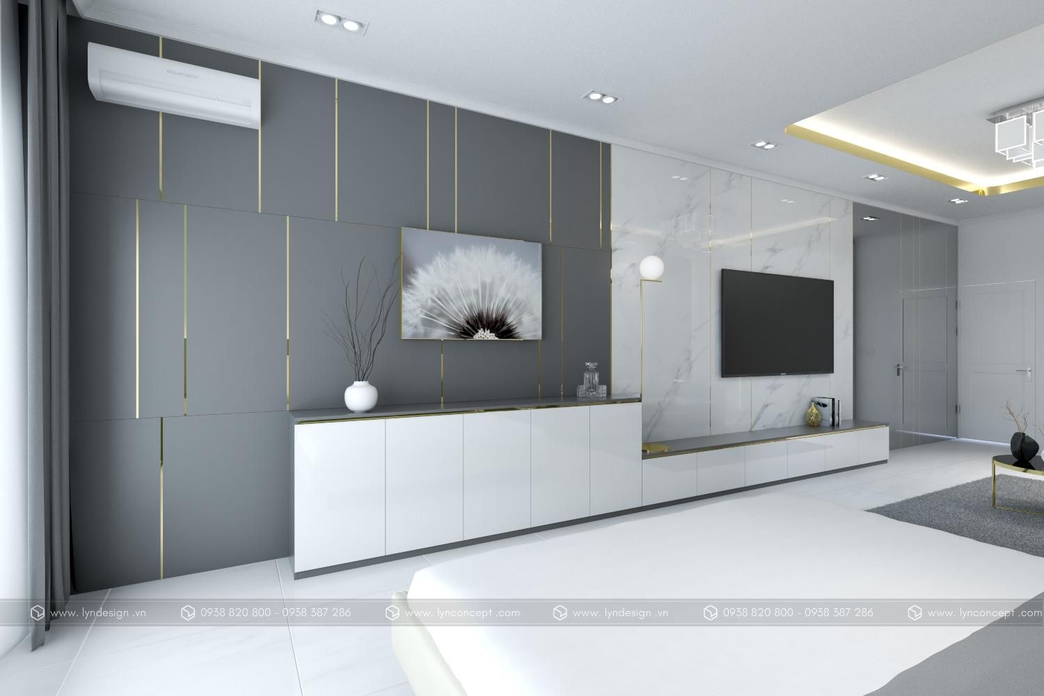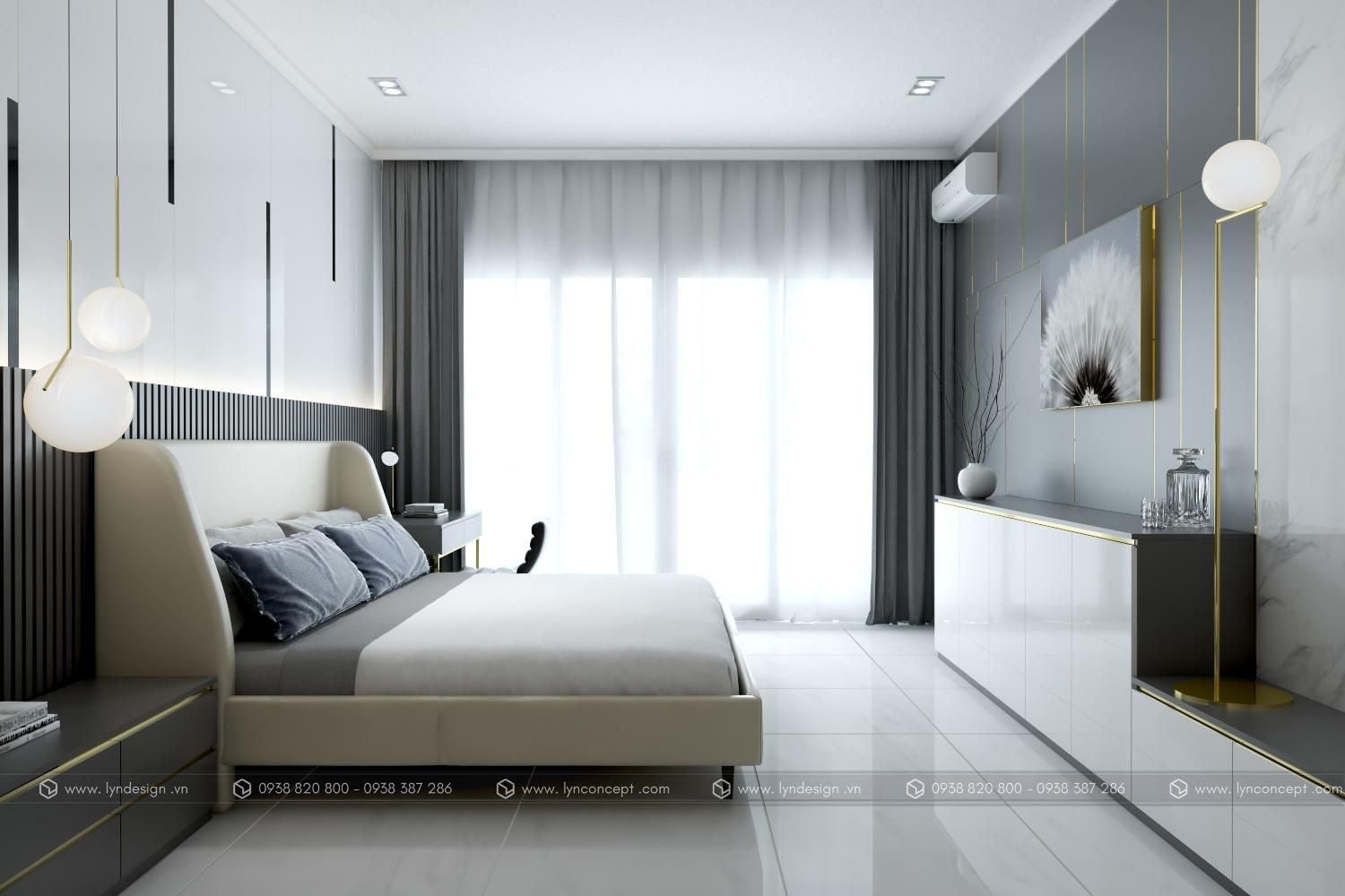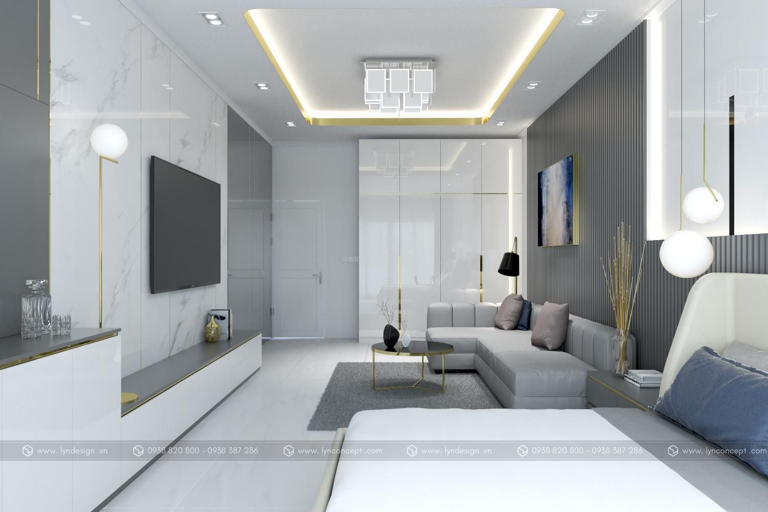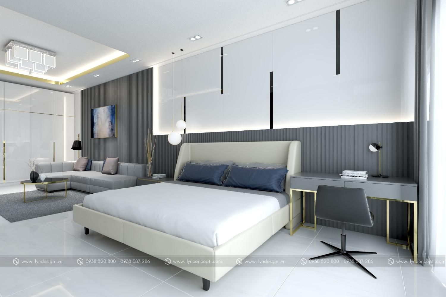 Ưu điểm của phòng ngủ Master chính là không gian diện tích vô cùng lớn giúp cho KTS của LYN Design dễ dàng bố trí các đồ nội thất đa dạng nhất nhưng vẫn giữ được không gian sinh hoạt cho chủ nhà dễ dàng nhất có thể.Các đồ nội thất được dùng trong phòng ngủ Master cũng theo phong cách sang trọng, nên đều là những món đồ hiện đại, tinh xảo và được thiết kế tỉ mỉ đến từng chi tiết.