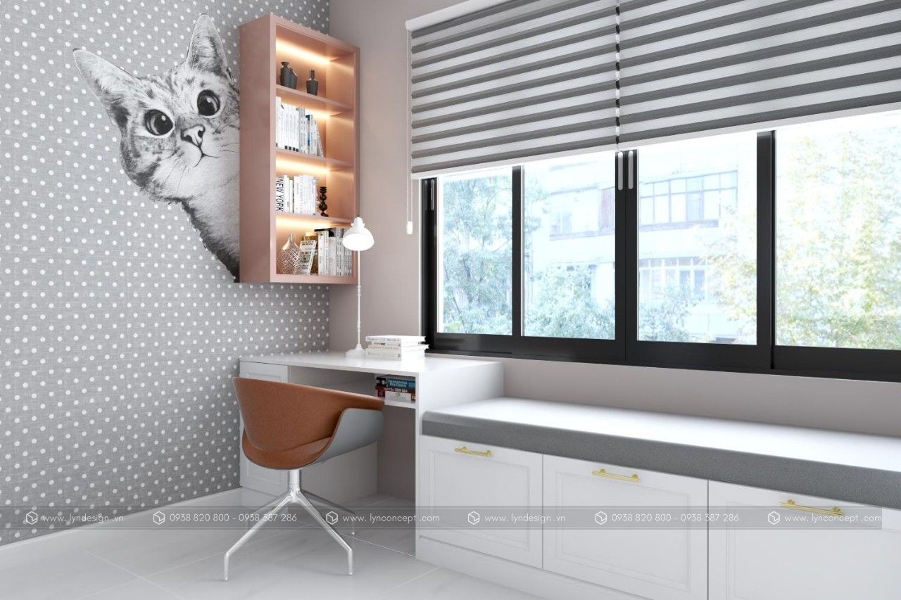 Với các nội thất vô cùng hiện đại và sang trọng như tủ quần áo cửa kéo, bàn làm việc kèm giá sách, ghế dài ngồi hoặc nằm cạnh cửa sổ ngắm view bên ngoài cực kỳ lãng mạn. Bục ngồi được thiết kế thông minh với những ngăn kéo lớn phía dưới là nơi chứa đồ hoàn hảo giúp căn phòng luôn thông thoáng. Ngoài ánh sáng từ những bóng đèn nhân tạo, căn phòng cũng được cung cấp một lượng lớn ánh sáng tự nhiên từ khung cửa sổ. Chính ánh sáng tự nhiên giúp tạo ra sự thông thoáng và cảm giác thoải mái cho căn phòng của bé.