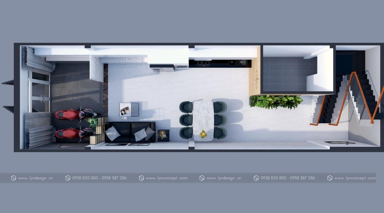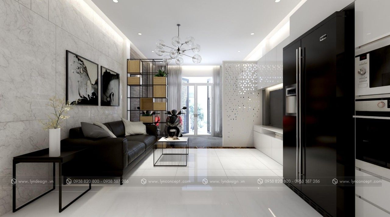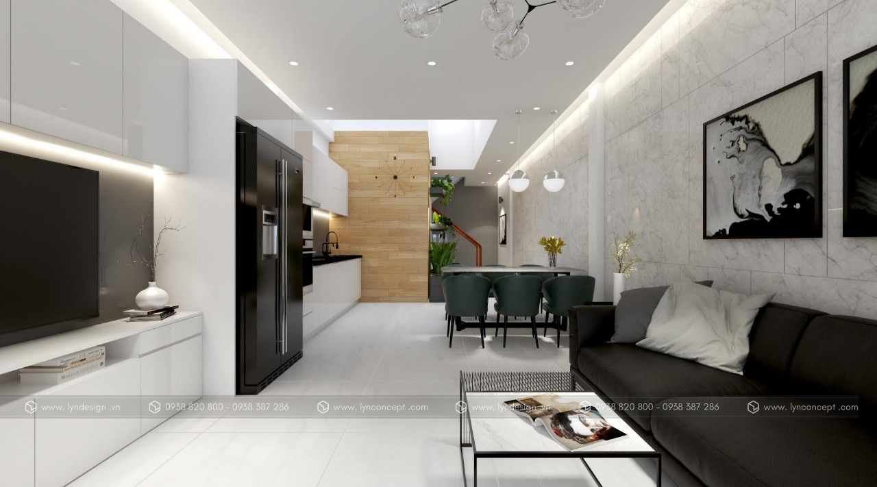 Sau khi khảo sát căn nhà phố và sở thích của chủ nhà, các kiến trúc sư của LYN Design quyết định lựa chọn các tông màu trung tính làm màu sắc chủ đạo cho căn nhà phố và sử dụng các nội thất đơn giản, nhẹ nhàng mang đến không gian căn nhà phố sự hiện đại và sang trọng. Là sự kết hợp hài hòa giữa các màu sắc, cùng sự sắp đặt hợp lý giữa các đồ vật trong nhà. Theo ý tưởng này thì gam màu sử dụng chung thường là tông màu trầm, trung tính như: màu trắng, xám, hay màu be...cùng các tông màu đen, ghi tạo điểm nhấn cho một số chi tiết, làm nổi bật không gian bên trong.