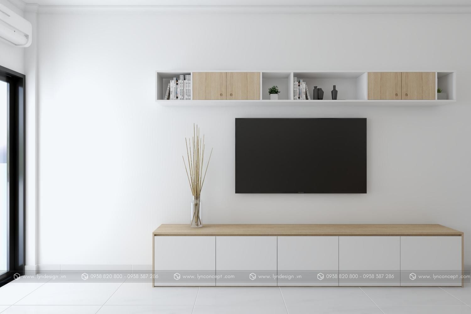 Ở phía đối diện giường ngủ là tủ tivi và kệ sách với nhiều hộc tủ lớn bé khác nhau giúp căn phòng thêm sinh động hơn. Kệ sách đồng bộ với màu tủ tivi giúp không gian trở nên độc đáo hơn.