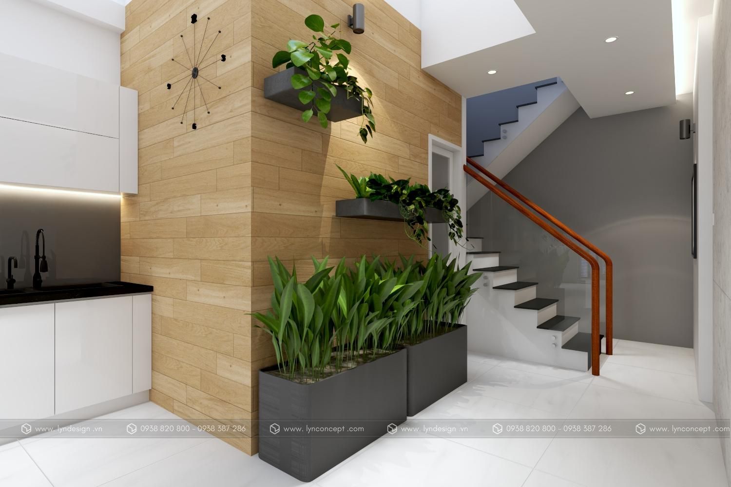 Bước vào ngôi nhà sẽ là khu vực để xe máy tận dụng không gian trống là khu vực để tủ giày thông minh nhiều ngăn tạo ra được diện tích lưu trữ giày dép vô cùng hữu ích. Không gian này sẽ thông với phòng khách và các KTS của LYN Design đã khéo léo sử dụng vách ngăn trang trí ngăn chia giữa 2 khu vực, vừa giúp ngăn chia không gian còn vừa là điểm nhấn bắt mắt cho ngôi nhà.