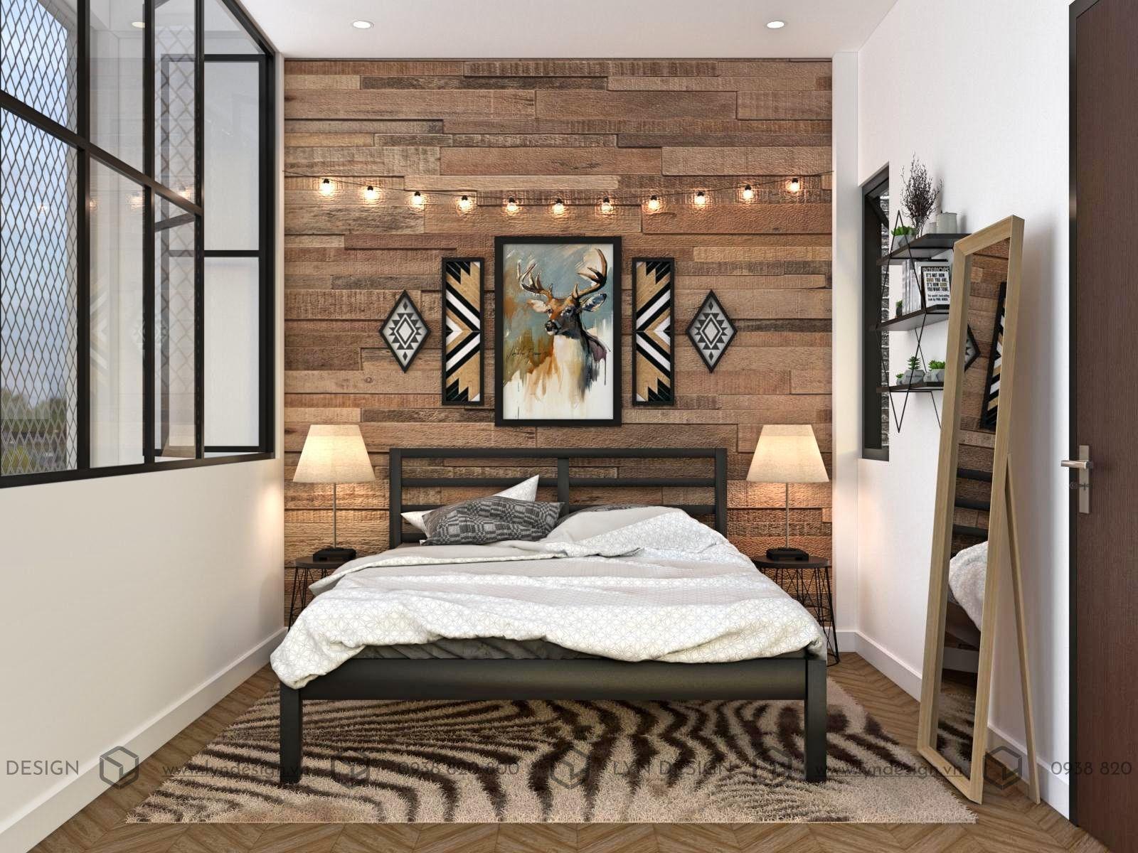 Bám sát phong cách thiết kế chính có tên gọi phong cách Scandinavia Bắc Âu căn phòng này cũng sẽ không ngoại lệ khi được tô điểm gam màu trắng chủ đạo làm cho không gian phòng homestay cảm giác rộng hơn, sáng hơn so với diện tích thực tế. Sử dụng vật liệu gỗ ốp tường ngay đầu giường có màu sắc nâu ấm kết hợp đèn treo tường trang trí bắc ngang và một vài vật dụng trang trí tiêu biểu của phong cách này như kệ sắt sơn đen treo tường hay một chiếc gương soi toàn thâm cỡ lớn đặt sát tường và tấm thảm trải sàn là một vật dụng không thể thiểu để mang đến vẻ đẹp hài hòa của căn phòng này.