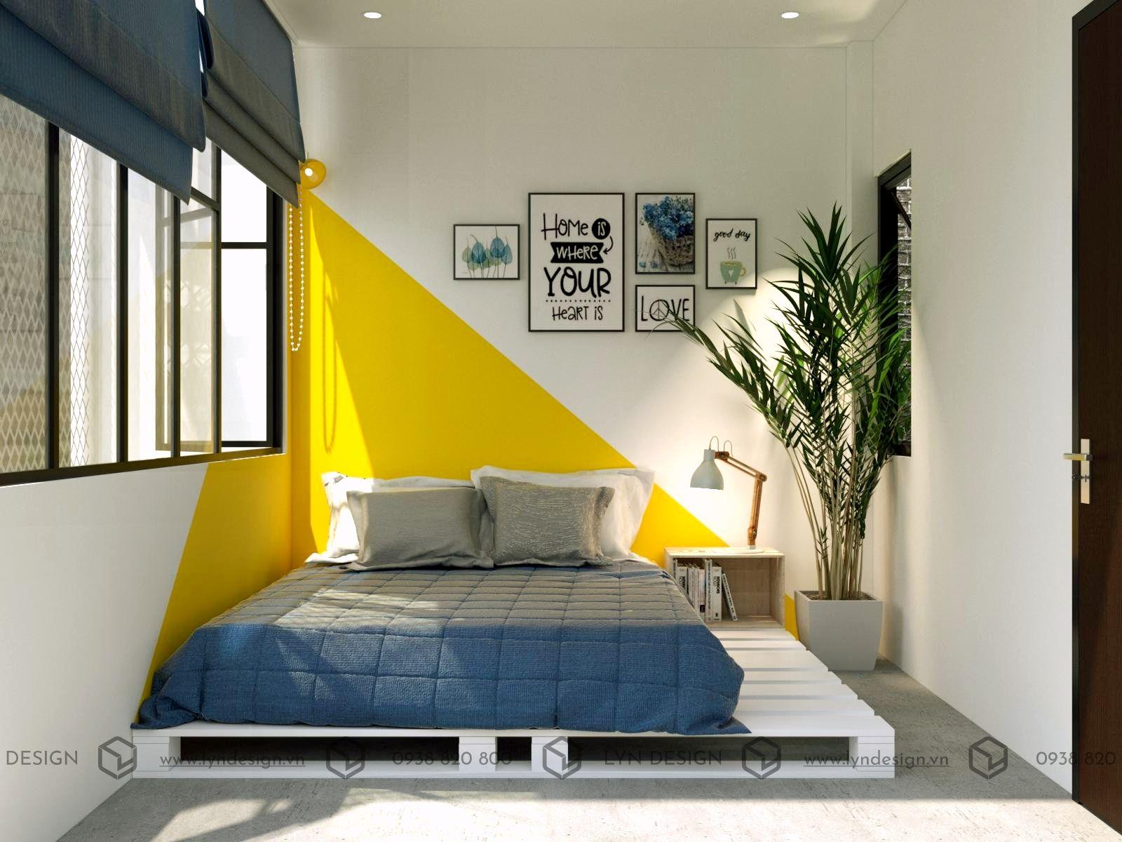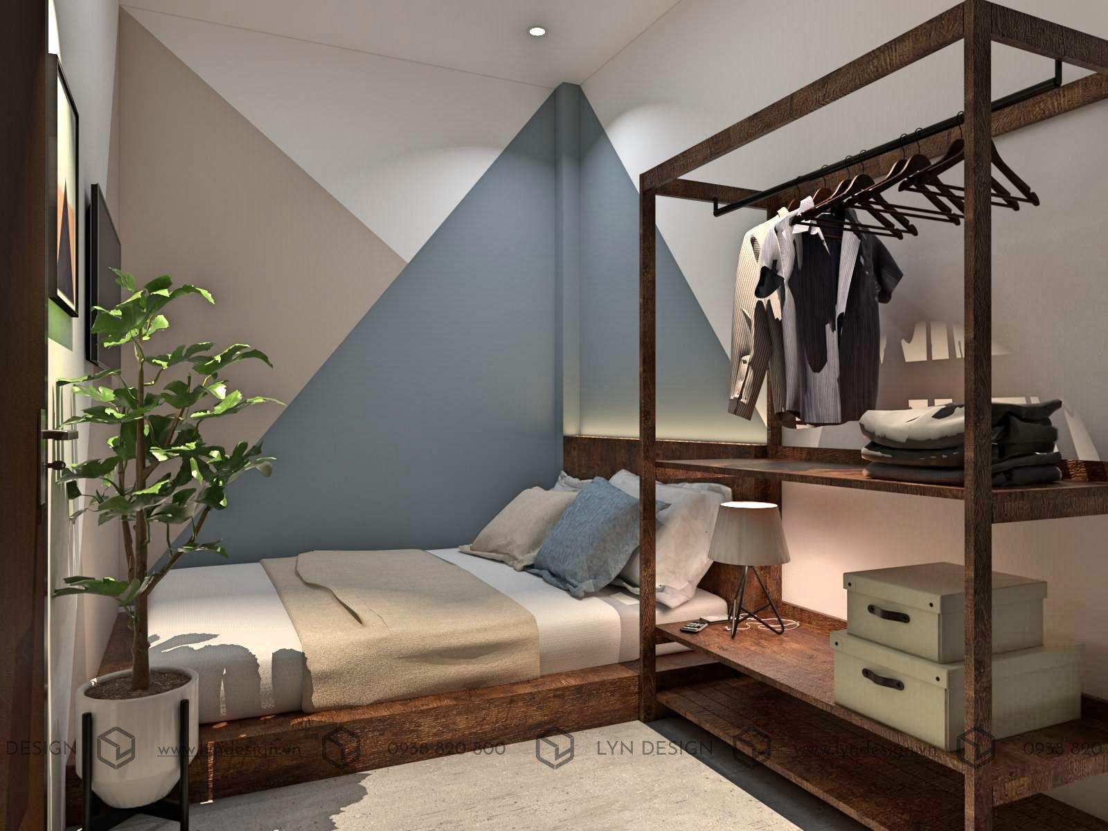 Căn phòng homestay này được thiết kế homestay theo phong cách hiện đại đặc trưng đến từ sự gọn gàng, đơn giản và tạo điểm nhấn bằng cách sử dụng khối hình học cơ bản tam giác độc đáo tạo nên nét riêng cho căn phòng, còn lại mọi chi tiết được đơn giản hóa tối đa, bề mặt trơn láng, ít chi tiết.