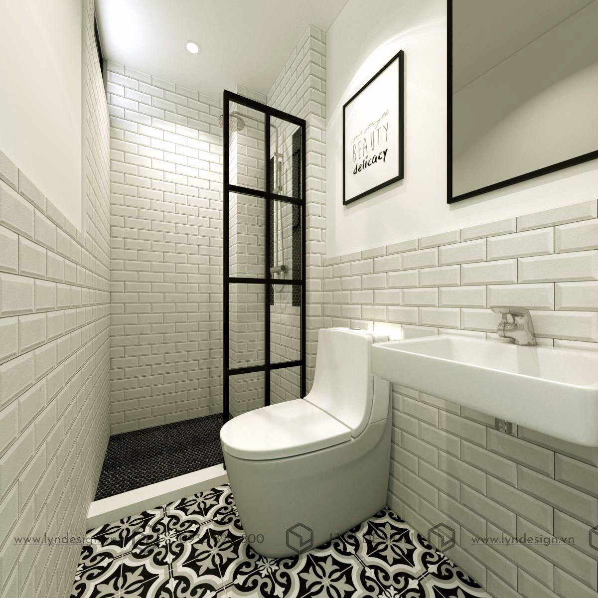 WC chung cho cả 2 phòng trọ lầu 1 được chăm chú tỉ mĩ đảm bảo đủ các công năng sử dụng như lavabo, bồn cầu, vòi tắm đứng, gương soi..... WC này được khoát lên mình phong cách Scandinavian Bắc Âu độc đáo từ những viên ốp tường trắng sứ kết hợp cùng viên lát nền hoa văn độc đáo, với 2 màu sắc trắng và đen huyền bí chủ đạo là điểm cộng cho khách hàng dễ dàng khi quyết định thuê homestay