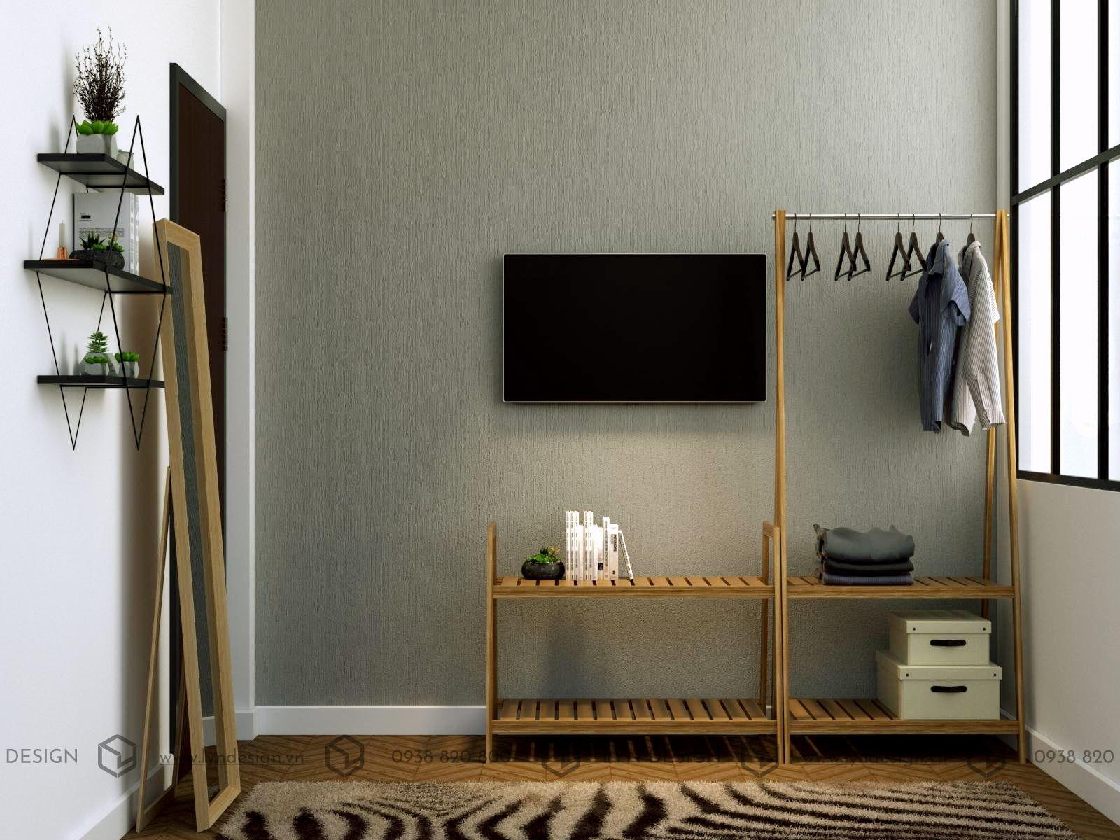 Căn phòng này theo phong cách hiện đại tương tự như phòng trước đó nhưng lại có màu sắc ấm cúng hơn bởi những màu sắc gỗ nâu trầm ấm đến từ chiếc giường phản đặt sàn và kệ treo quần áo đơn giản. Diện tích tuy nhỏ nhưng đủ để bố trí các vật dụng nội thất cho khách thuê phòng sử dụng.