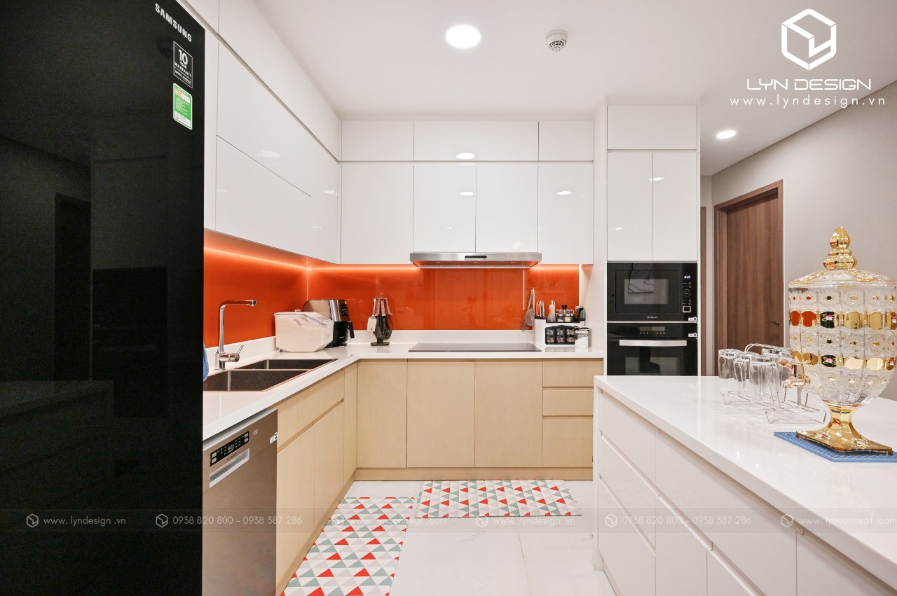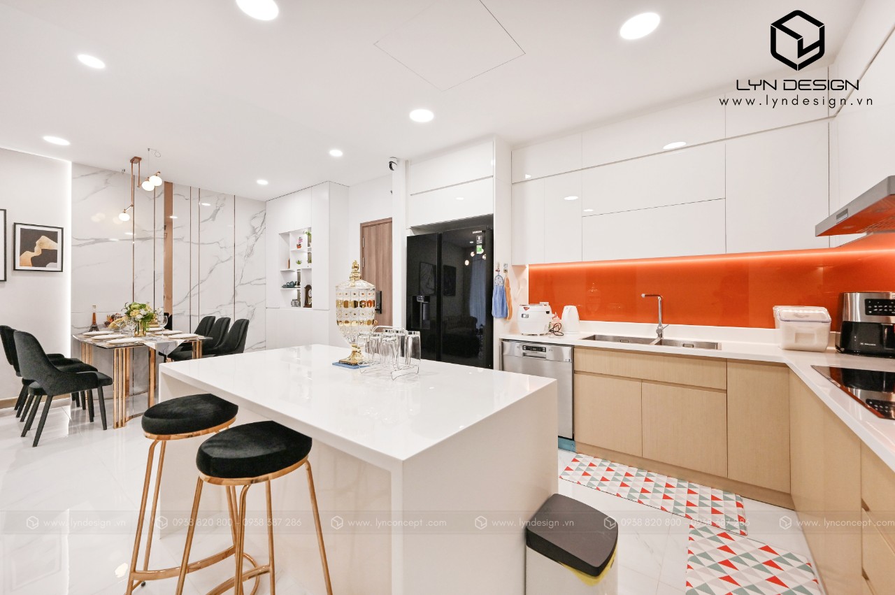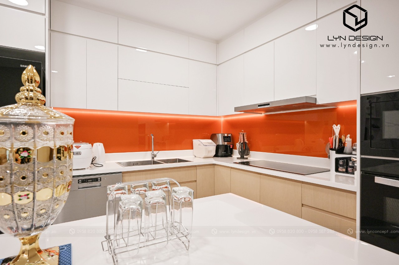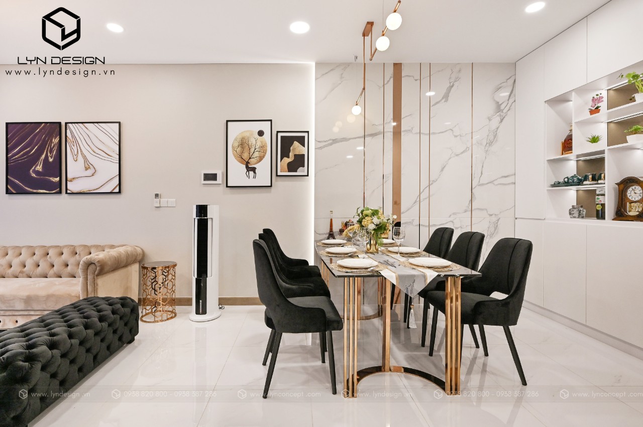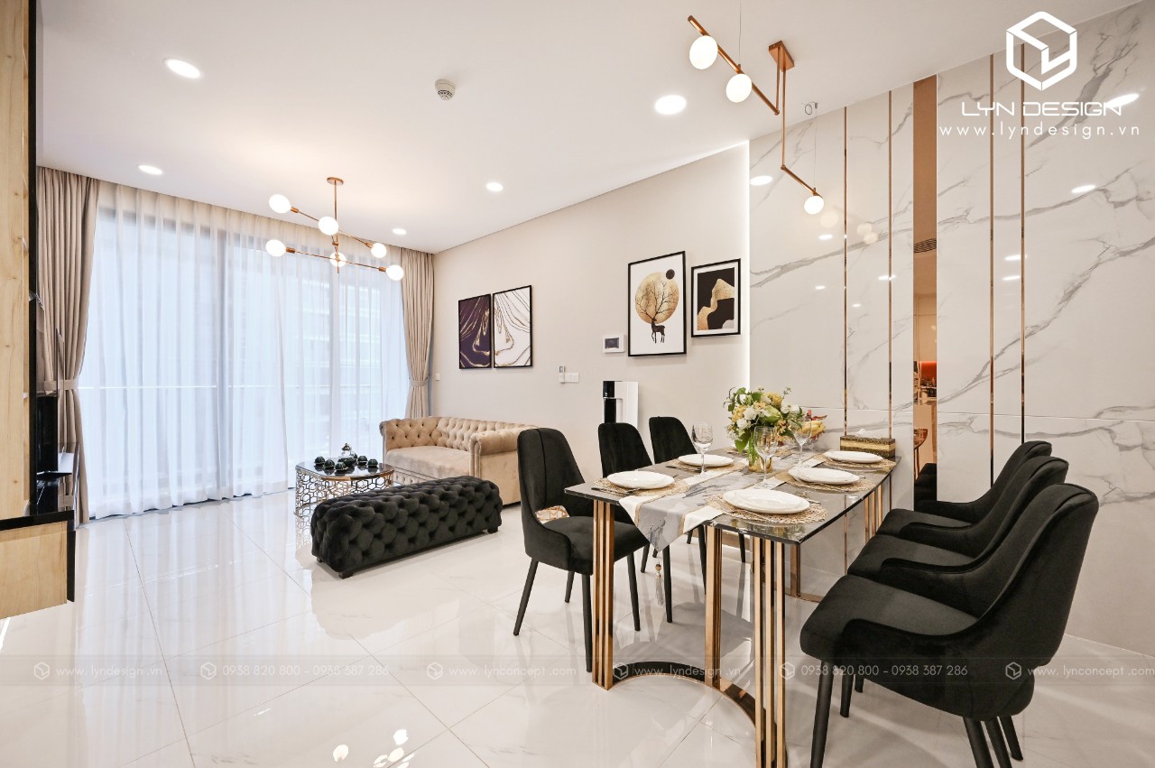 Trong căn hộ này, LYN Design vận dụng phong cách hiện đại bằng những đường thẳng tắp hài hòa với tông màu kem sang trọng. Bộ ghế sofa cùng tông màu tô thêm vẻ thanh lịch và cao cấp của căn hộ. Hơn nữa, ý tưởng thiết kế là điều chúng tôi luôn bận tâm. Nó phải thể hiện được phần nào tâm hồn và cá tính của gia chủ thì không gian tổ ấm này mới xứng đáng.