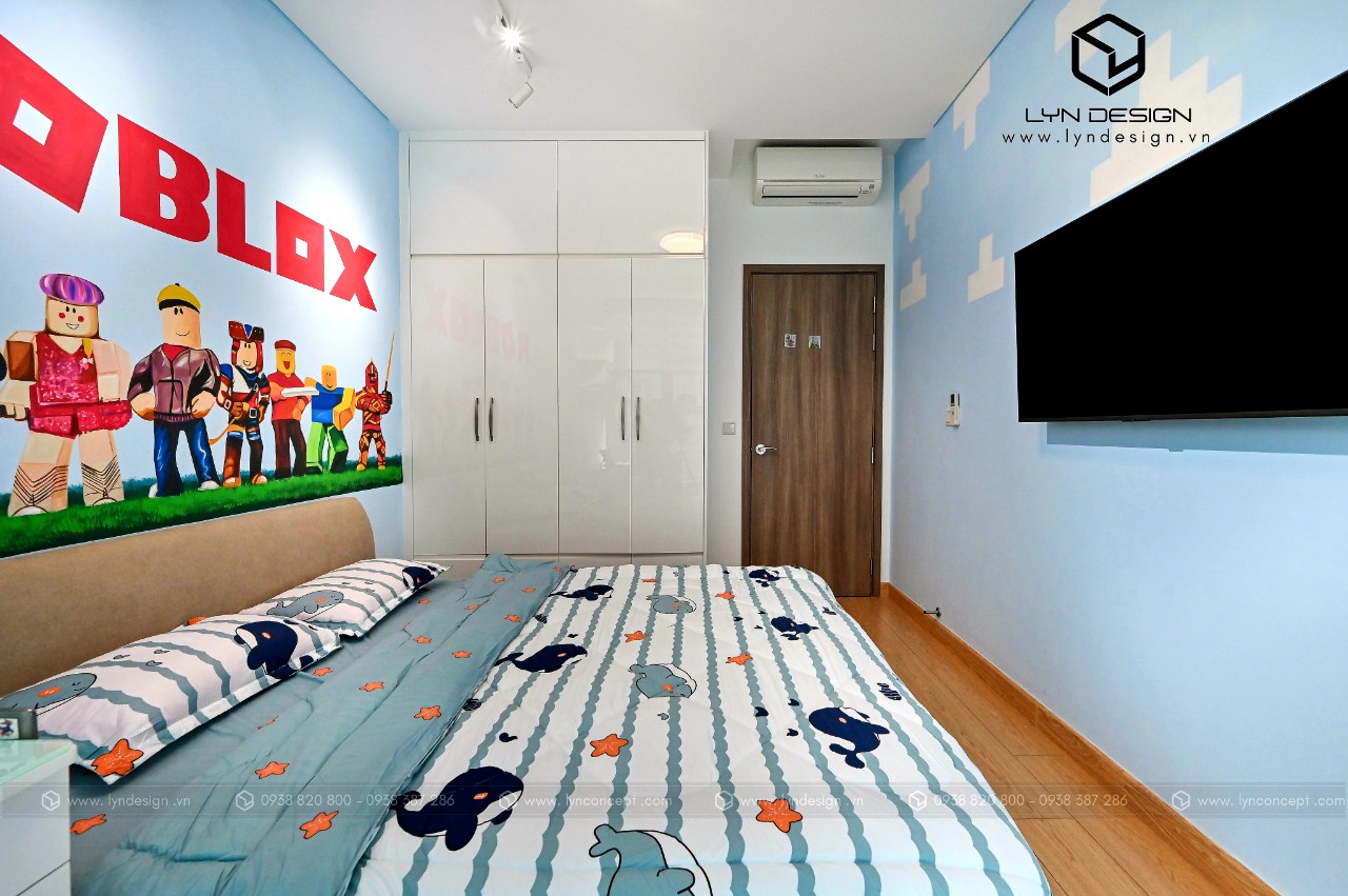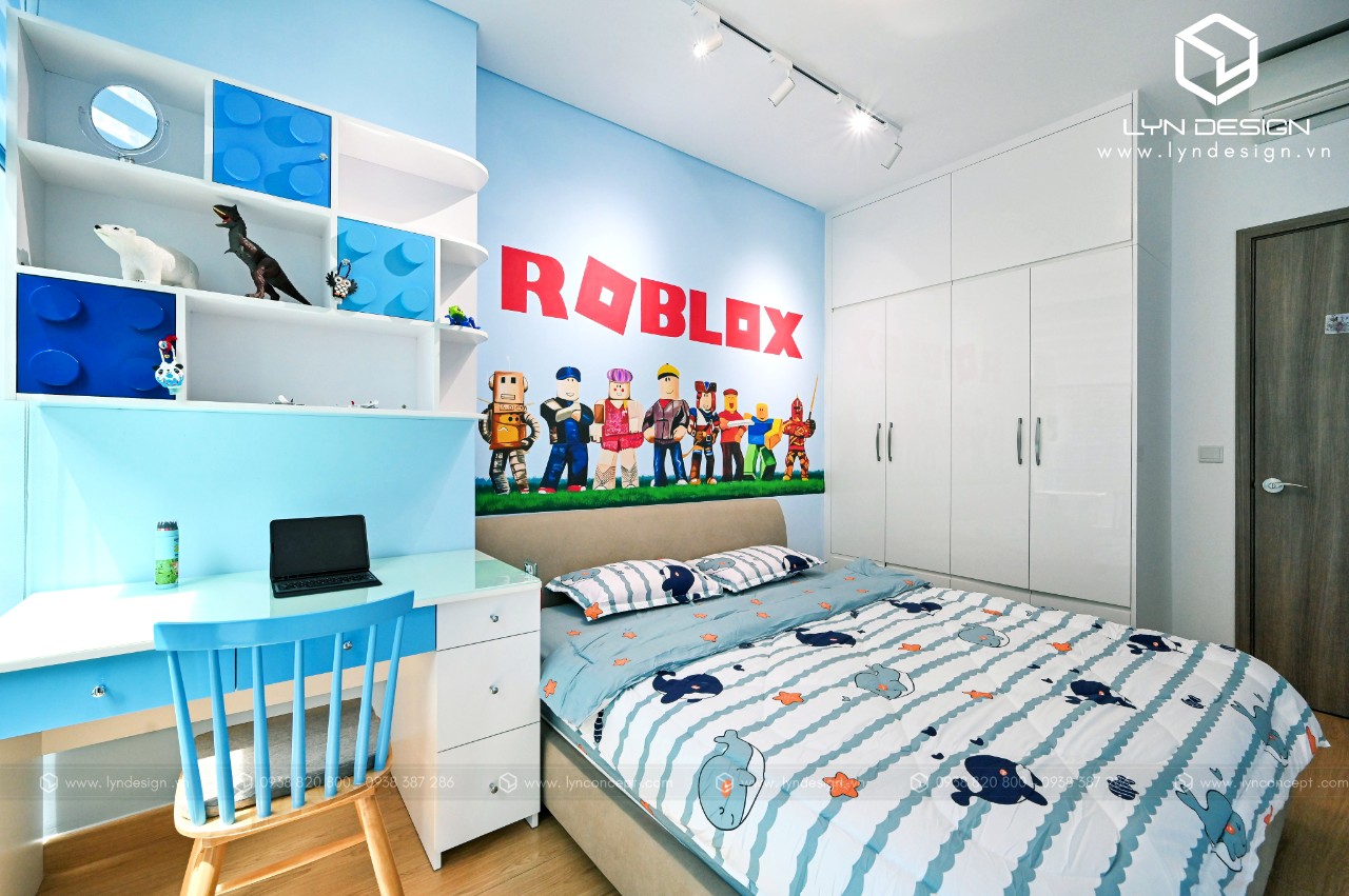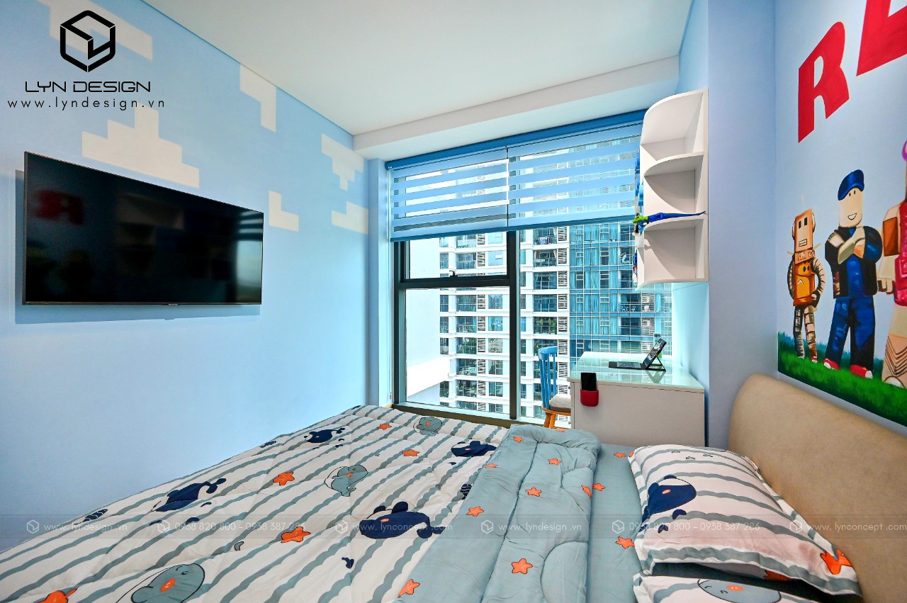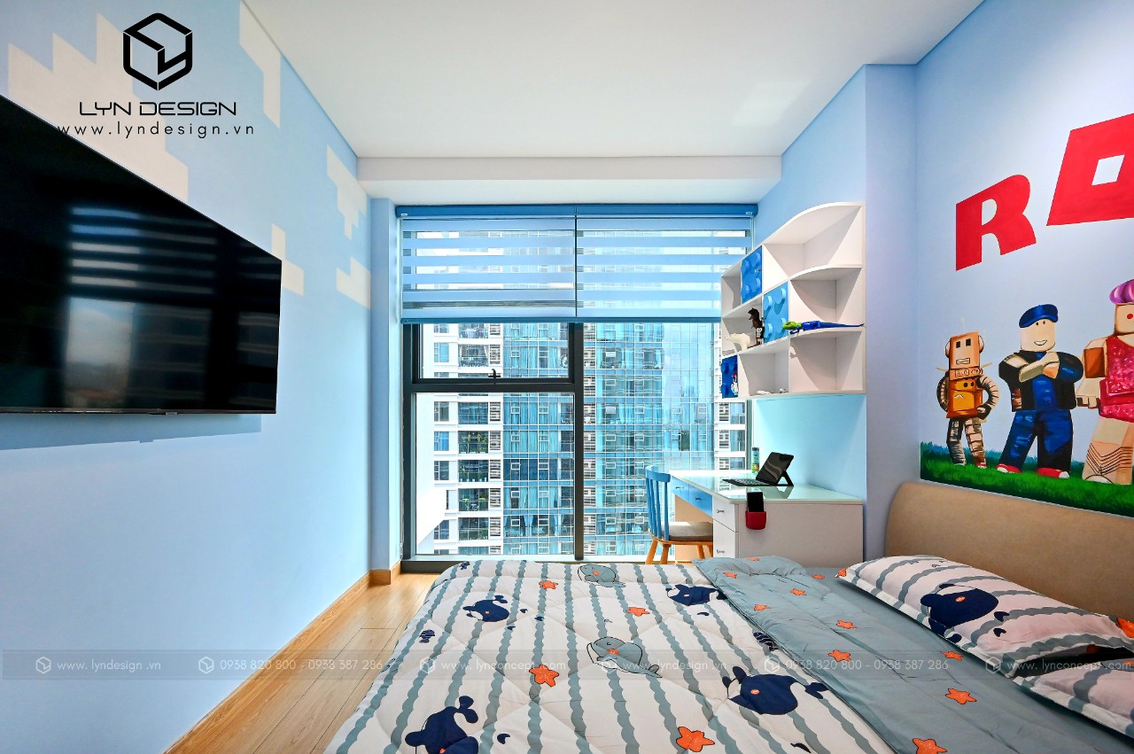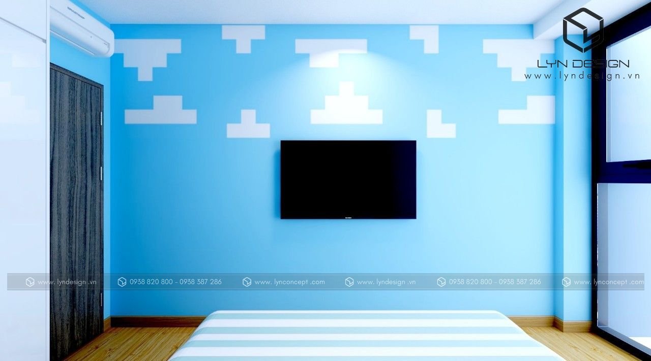 Thiết kế phòng ngủ cho bé trai theo phong cách hoạt họa bắt mắt. Gam màu xanh làm cho ta cảm giác rất là dễ chịu, và làm sáng hẳn lên căn phòng ngủ. Tạo ra một không gian thoáng mát giúp bé học hành và vui chơi thoải mái hơn.