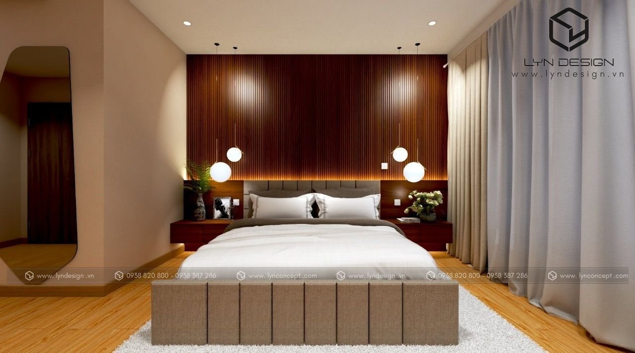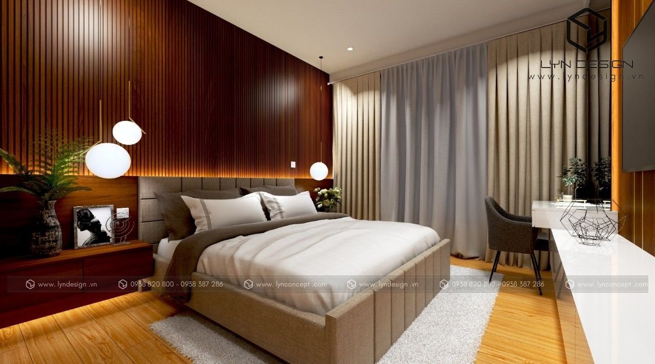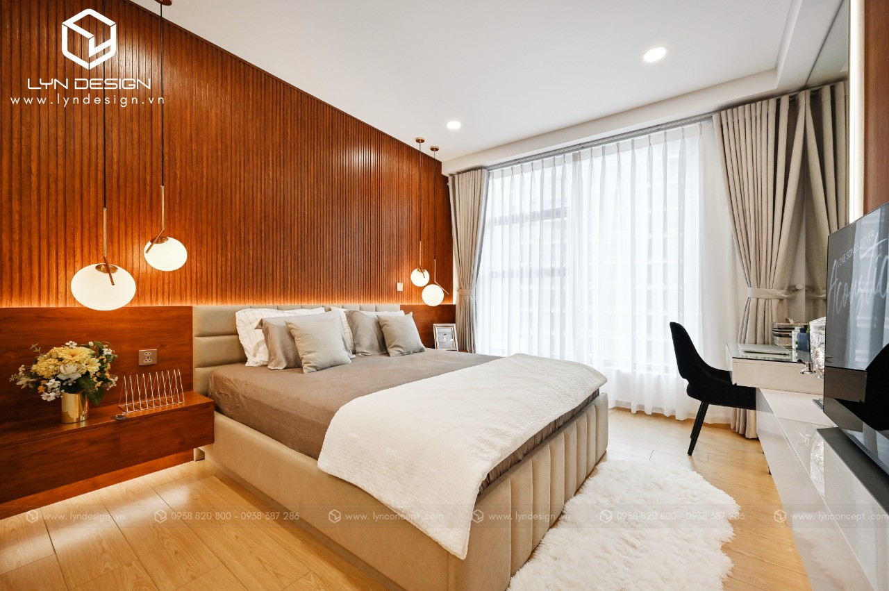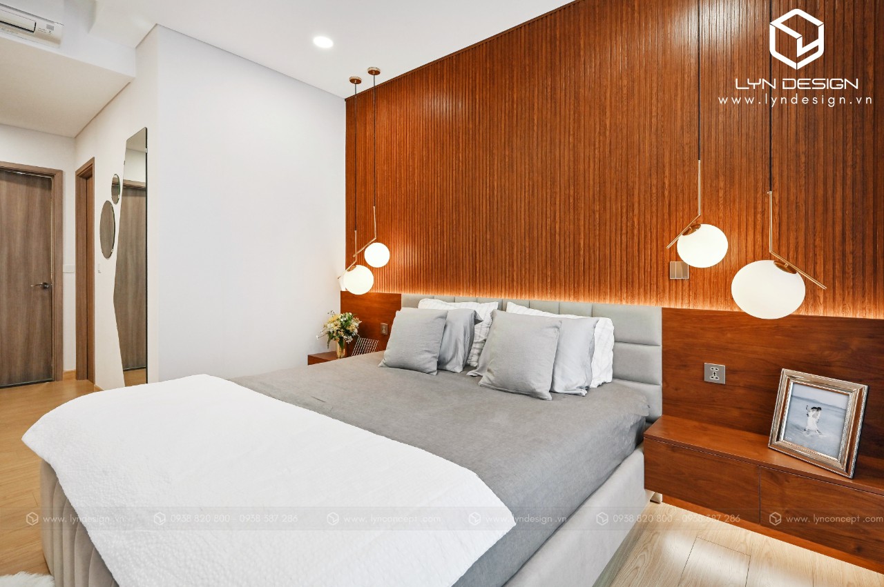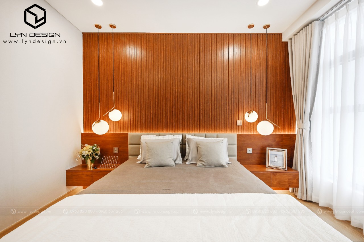 Nội thất gỗ giúp căn phòng trở nên ấm áp và thân thiện nhất. Vách ốp đầu giường được thiết kế ấn tượng bằng vách lam gỗ củng màu với tab đầu giường làm điểm nhấn cho cả căn phòng.