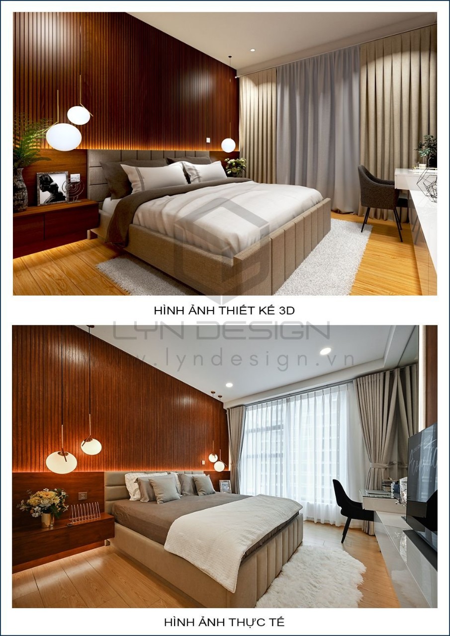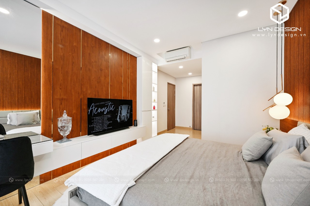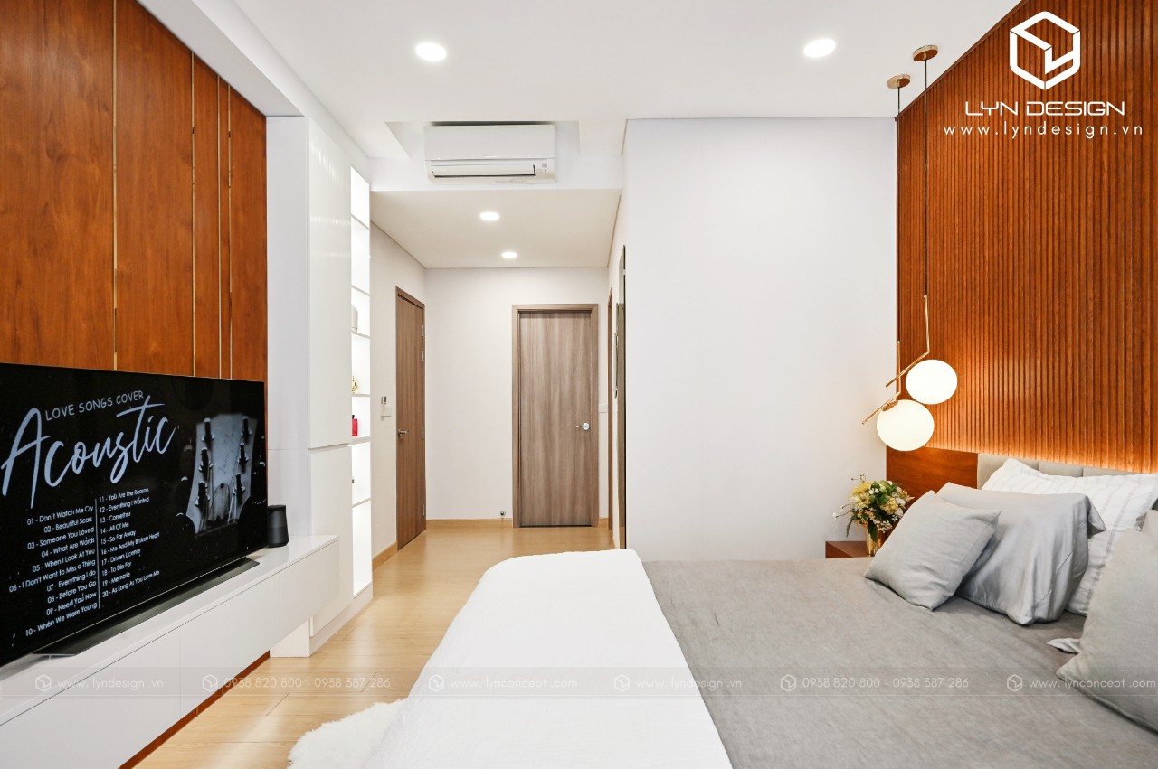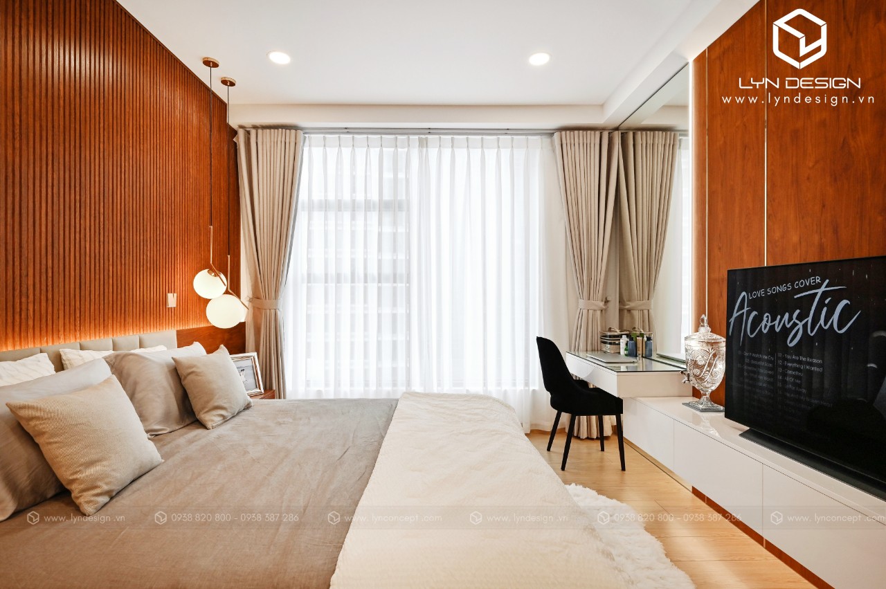 Nội thất gỗ giúp căn phòng trở nên ấm áp và thân thiện nhất. Vách ốp đầu giường được thiết kế ấn tượng bằng vách lam gỗ củng màu với tab đầu giường làm điểm nhấn cho cả căn phòng.