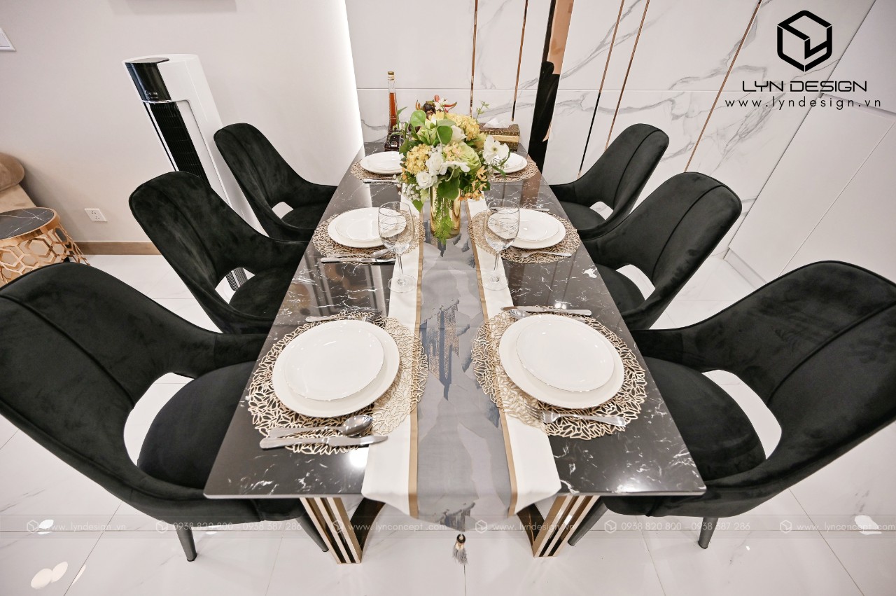 Bàn ăn hiện đại kết hợp chân bàn được làm bằng chất liệu inox mạ vàng tăng thêm sự tinh tế và sang trọng cho ngôi nhà.