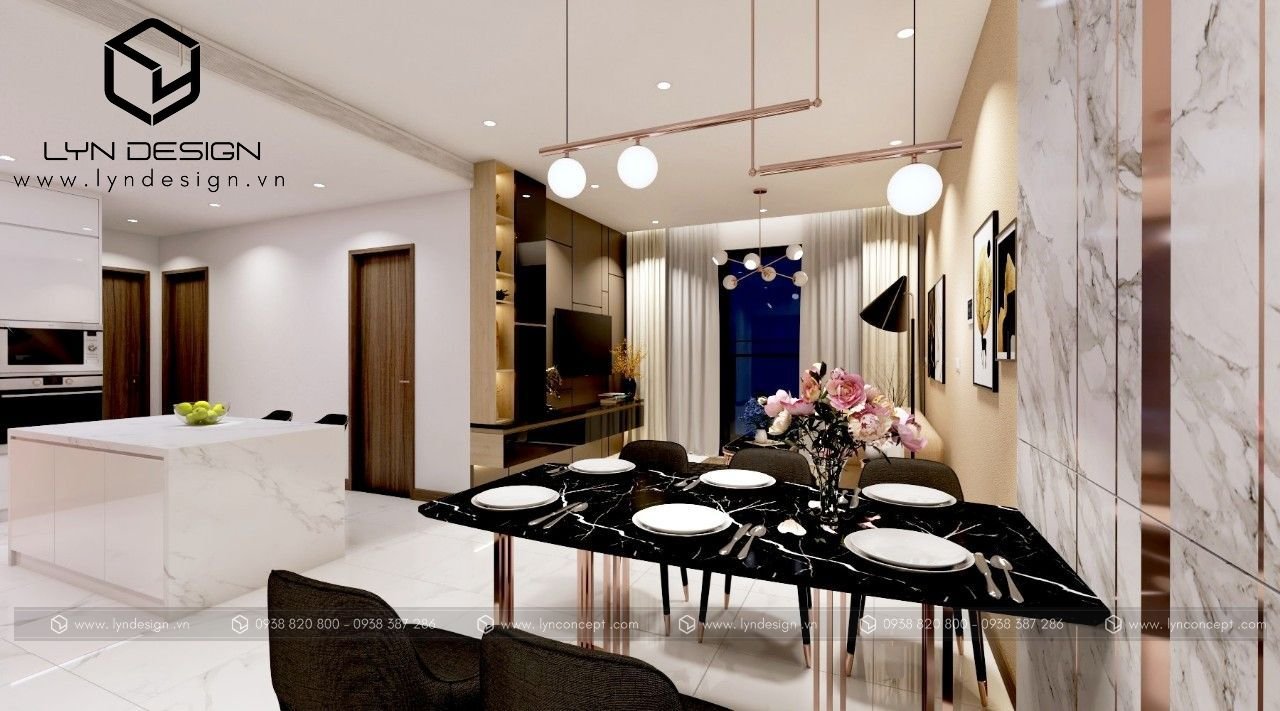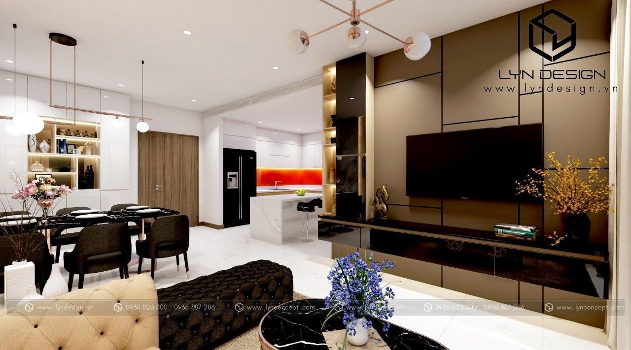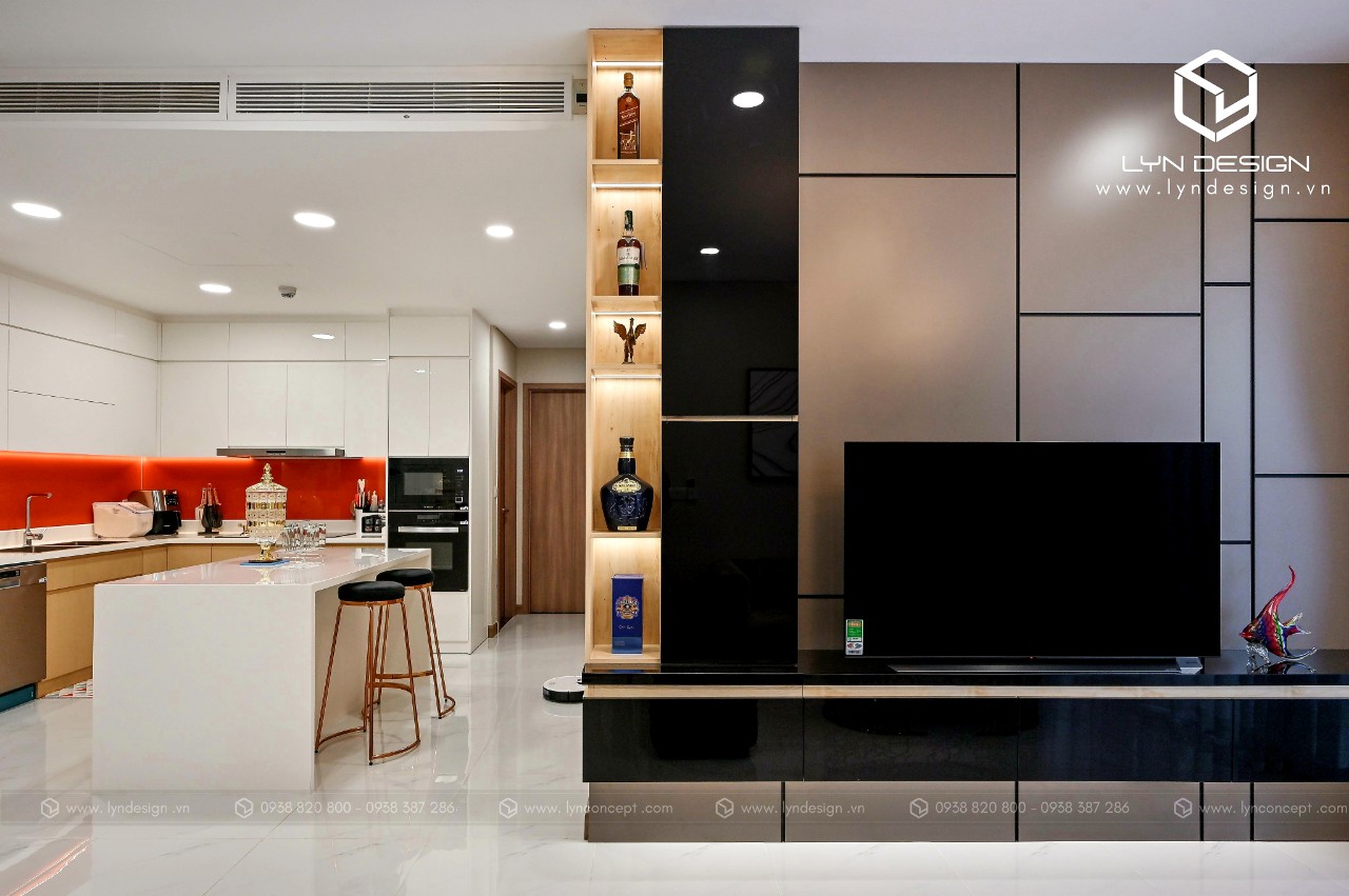 Xu hướng thiết kế phòng khách và phòng bếp liền kề được LYN Design tinh tế lựa thiết kế cho nội thất căn hộ Sunwah Pearl. Từng chi tiết nội thất hiện đại đan xen bên trong dường như từ lâu đã được thống nhất với nhau, chỉ tỏa sáng khi đặt cạnh nhau. Không gian phòng khách & bếp được lựa chọn và bố trí nội thất chuẩn mực tạo cho người dùng cảm giác thoải mái sau khi sử dụng.