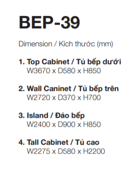 - Kích thước tủ bếp: tùy theo kích thước phòng bếp