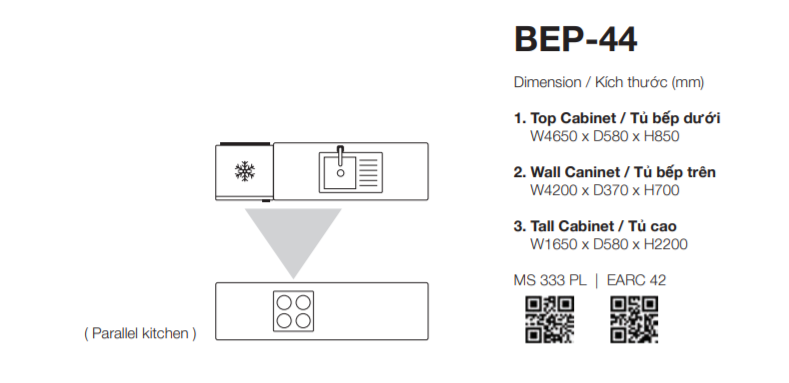 - Giá để dao thớt, kệ gia vị, khay úp chén, giá để xoong nồi, tủ đồ khô chưa bao gồm