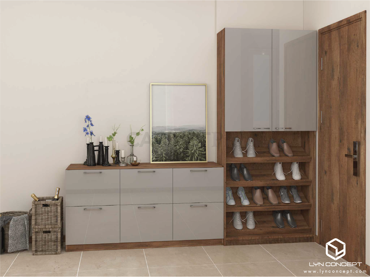 - Kích thước tủ giày: tùy theo kích thước phòng khách