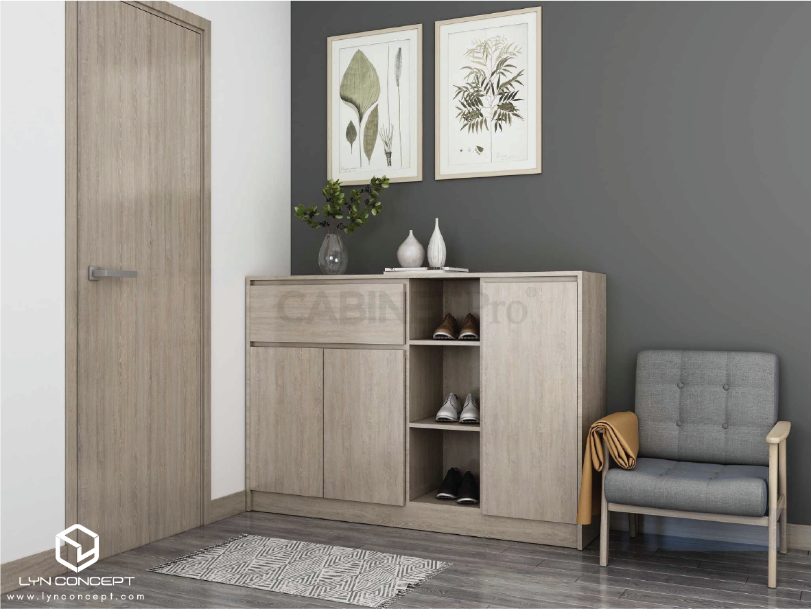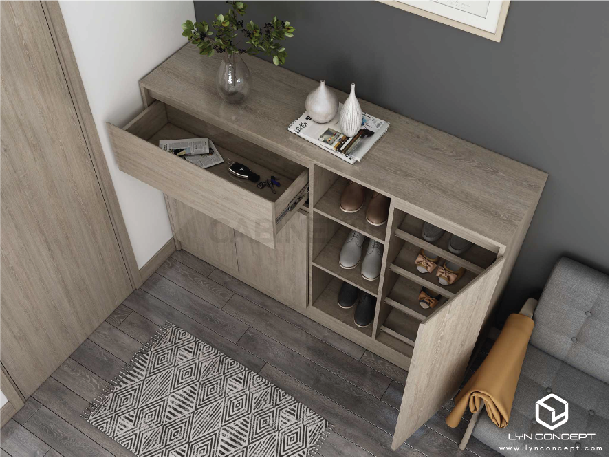 - Kích thước tủ giày: tùy theo kích thước phòng khách