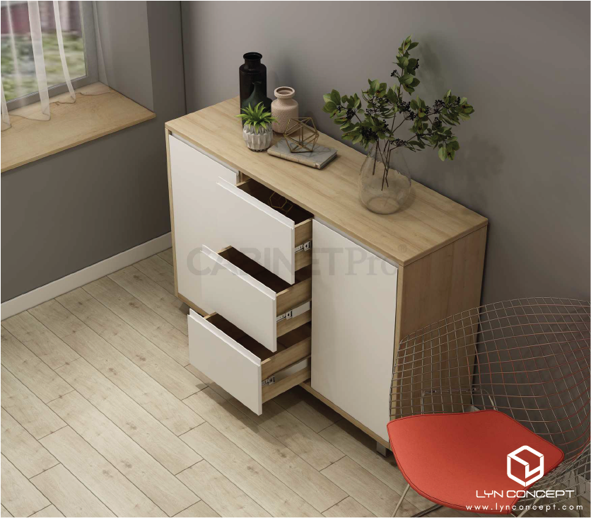 + Phụ kiện miễn phí đi kèm tủ trang trí: bản lề giảm chấn, ray bi trượt 3 tầng, tay nắm, pít tông hơi…