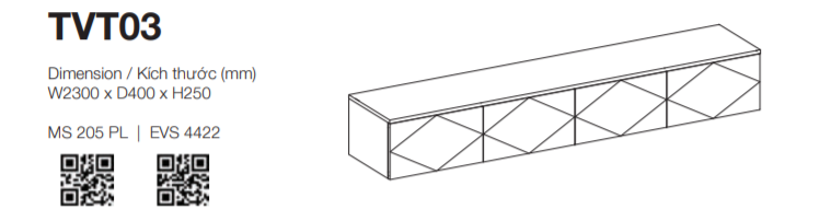 - Kích thước tủ tivi: W2300 x D400 x H250 (mm)