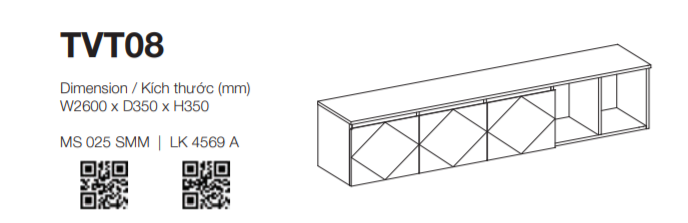 - Kích thước tủ tivi: W2600 x D350 x H350 (mm)